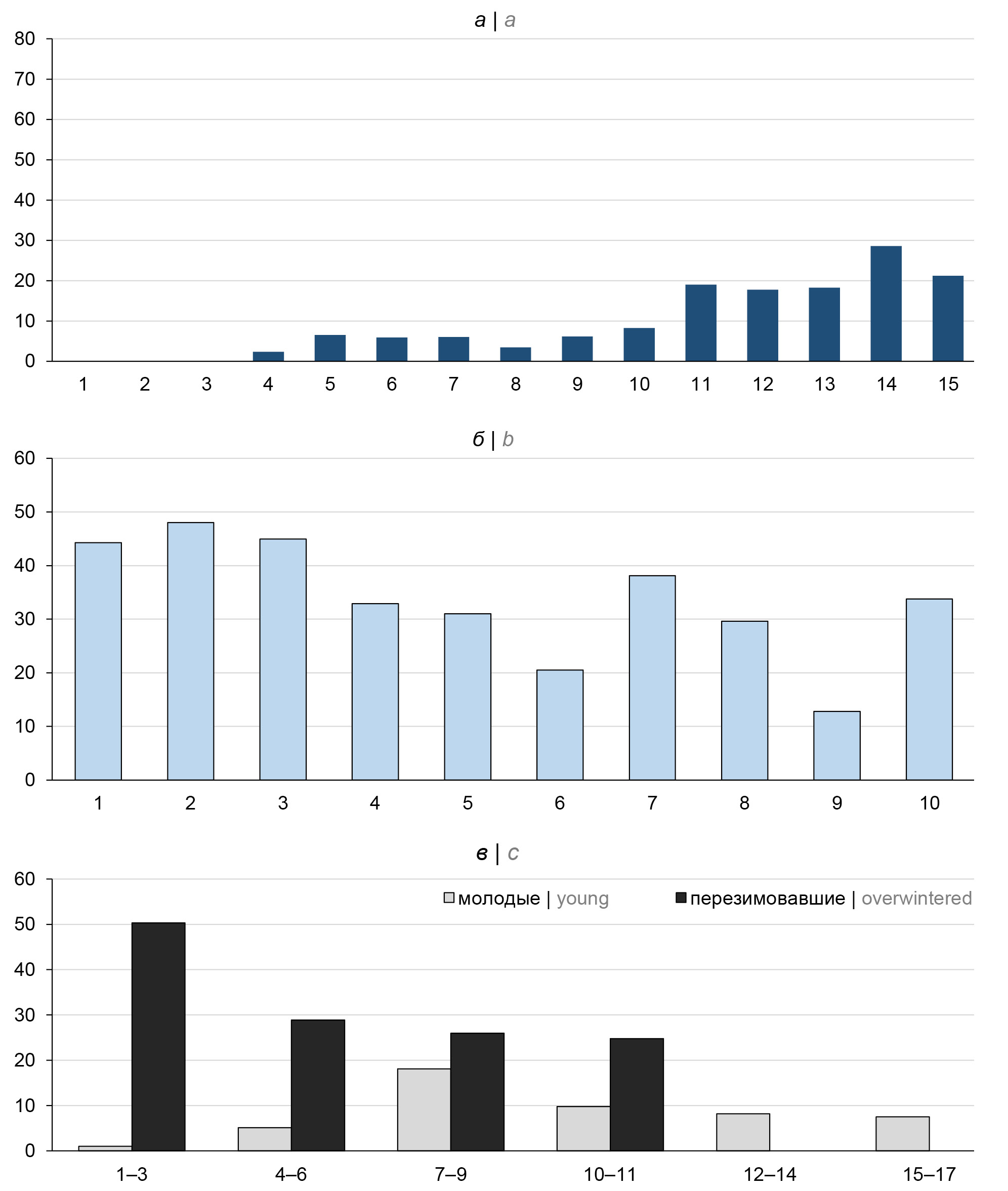 Предполагалось, что выраженный половой диморфизм у блох должен отражаться на способности к сохранению и распространению Y. pestis самками и самцами. По результатам 3 опытов, проведённых в июле–августе (в разные годы), доля «блокированных» самцов C. tesquorum в этот период значительно превышала долю самок с «блоком» (рис. 2, а). Половые различия по данному признаку достоверны для показателей всех анализируемых летних опытов (для первого и второго — р < 0,05, для третьего — р < 0,001). Процесс «блокообразования» у самцов начинался и заканчивался раньше, чем у самок. При этом закономерных половых различий в формировании бактериальных «глыбок» в летний период не обнаружено (рис. 2, б). Первых самок с «глыбками» Y. pestis регистрировали в те же сроки, что и самцов.