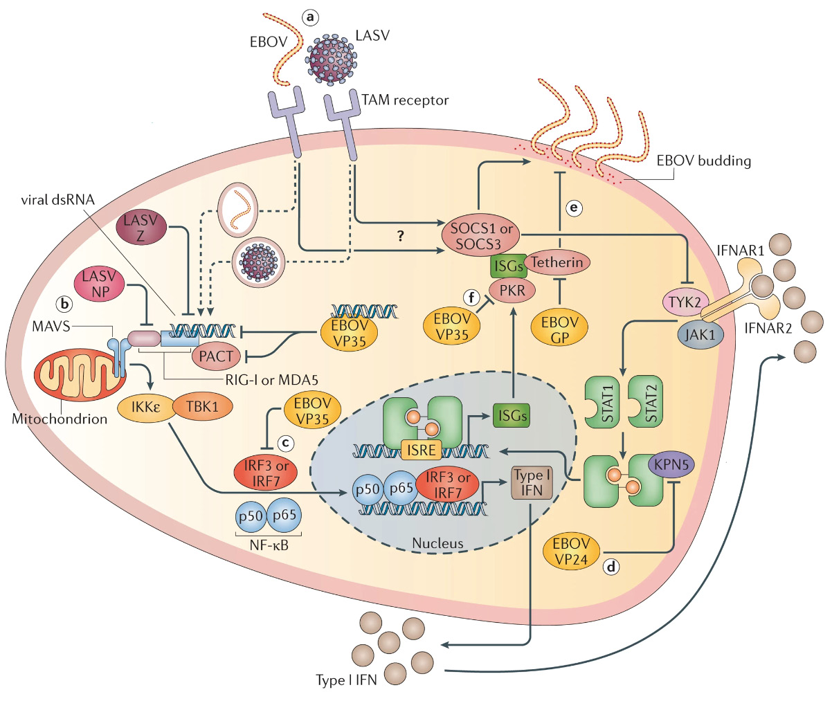Рис. 2. Иммунная активация клеток-мишеней и противодействие ей вирусами Эбола и Ласса при репродукции [25].