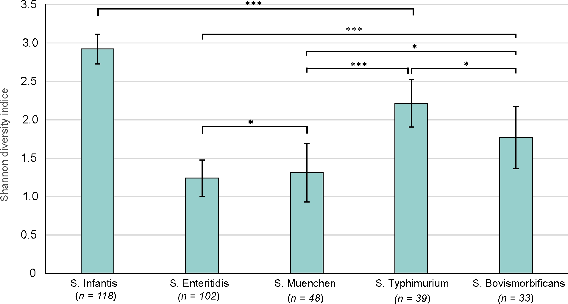 Fig. 2. Distribution of Shannon diversity indices (indicating 95% CI) for Salmonella serotypes not associated with outbreaks and with the largest number of resistance profiles. * — slightly different in diversity (p > 0.05); *** — significant difference (p < 0.05).