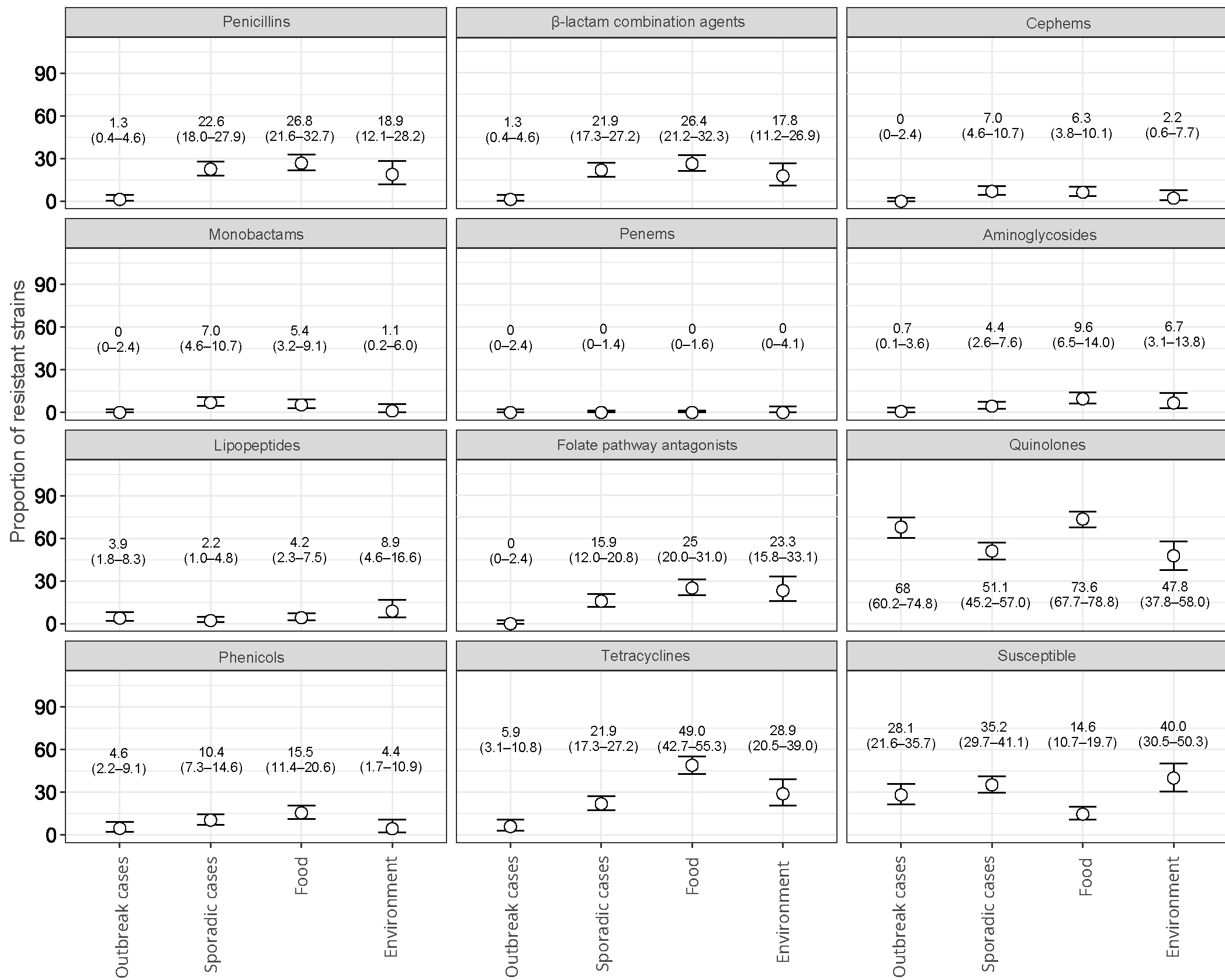 The proportion of strains resistant to quinolones and associated with outbreak incidence (68.0%; 95% CI 60.2–74.8) and food products (73.6%; 95% CI 67.7–78.8) was higher compared to other sources.