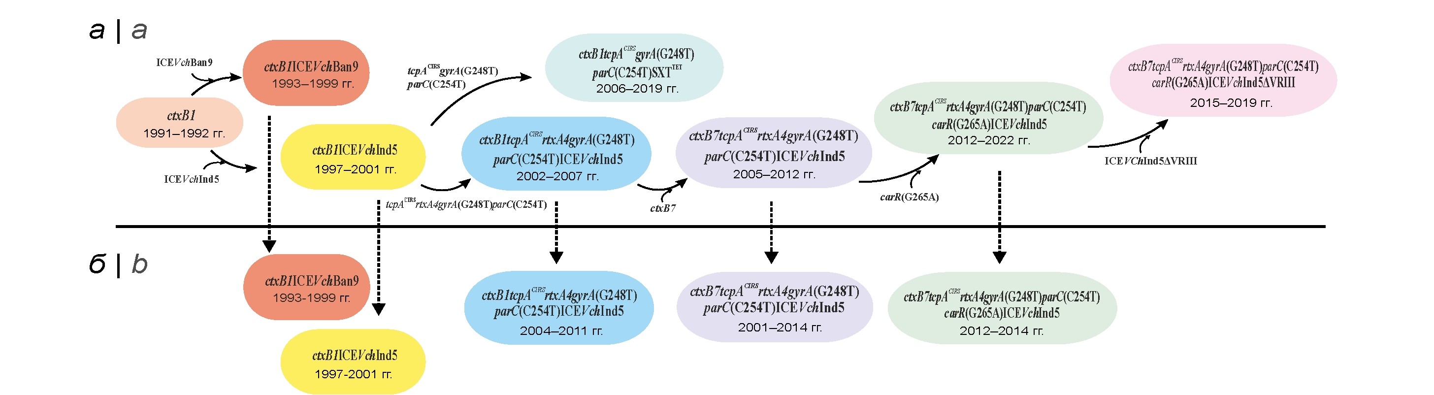 Из анализа полученных нами данных динамика изменения изучаемых свойств генетических вариантов возбудителя холеры El Tor представляется следующей (рис. 1, а). Первый этап — приобретение исходными геновариантами (ctxB1) различных типов SXT-элемента через горизонтальный перенос генов (1993–2001 гг.). Это событие привело к формированию штаммов 2 генотипов, различающихся набором генов резистентности к антибиотикам, — ctxB1ICEVchBan9, содержащих 7 генов (floR, strAB, sul2, dfrA1 и tetAR), кодирующих резистентность к хлорамфениколу, стрептомицину, сульфаниламиду, триметоприму и тетрациклину соответственно, и ctxB1ICEVcInd5, имеющих лишь 5 генов (floR, strAB, sul2 и dfrA1) при отсутствии генов tetAR. Все последующие этапы были связаны с мутациями генов патогенности и коровых генов резистентности к антибиотикам.