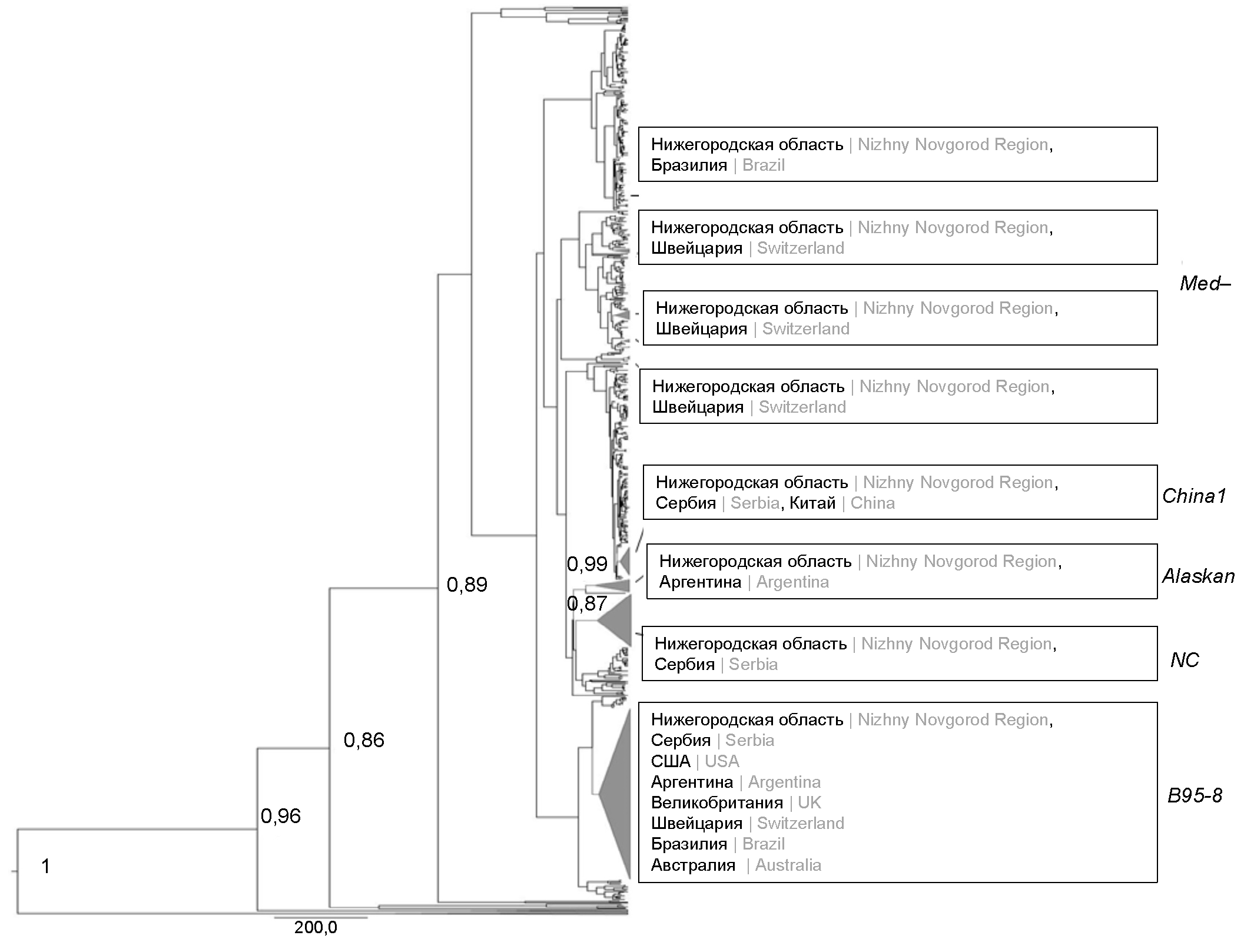 Только один идентифицированный нами нижегородский изолят (OP105219) образовывал единый кластер и показал высокую вероятность филогеографической связи (значение апостериорной вероятности, равной 0,99) с референсной последовательностью Alaskan и последовательностями, полученными в Аргентине. Общую группу также образовывали изоляты China 1, полученные из Нижегородской области, Сербии и Китая. Однако значительного генетического сходства между ними не выявлено в связи с низкими значениями апостериорной вероятности. Похожая апостериорная вероятность отмечалась и в кластере с нижегородскими изолятами B95-8. Эта группа включала наибольшее количество последовательностей, выделенных в различных регионах мира (Сербии, Аргентине, Великобритании, Швейцарии, Бразилии, Австралии и США). Генетическое родство с апостериорной вероятностью 0,87 с последовательностями из Сербии показали нижегородские изоляты ВЭБ и геновариант NC, сформировав на дереве единую монофилетическую группу. Нижегородские последовательности Med– не образовывали отдельного единого кластера, а распределились между генетически близкими изолятами из Бразилии и Швейцарии.