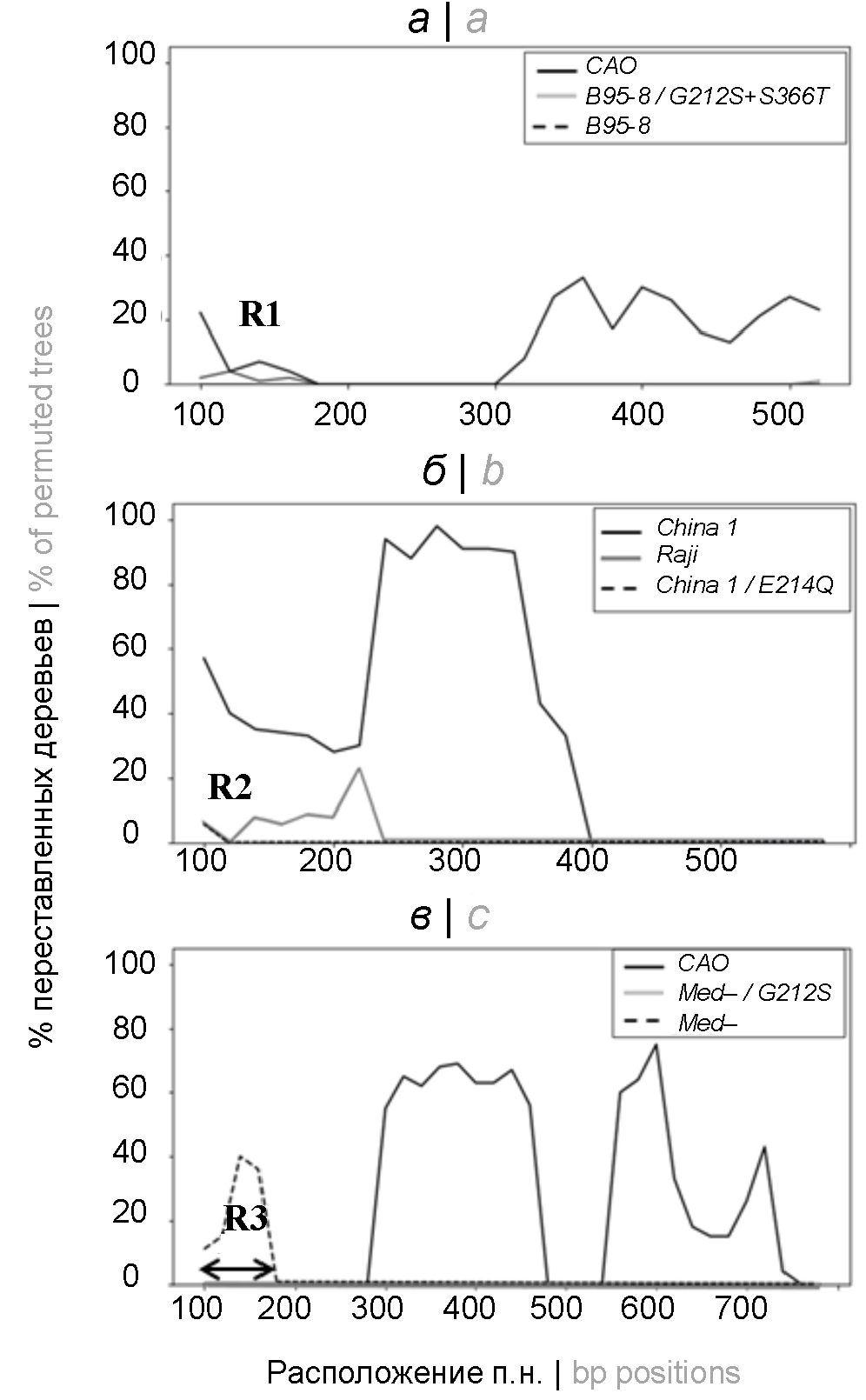 В дальнейшем нами проведён рекомбинационный анализ всех нижегородских последовательностей, которые образовали кладу вместе с Med– и содержали мутацию G212S, характерную для штамма CAO. В качестве внешней группы была включена последовательность B95-8. На рис. 2, в видна общая область (R3) пересечения всех нижегородских последовательностей Med– с мутацией G212S и CAO в домене CTAR1 (192–232 а.к.). В связи с этим мутация G212S в нижегородских последовательностях Med– могла появиться вследствие рекомбинации Med– и CAO.