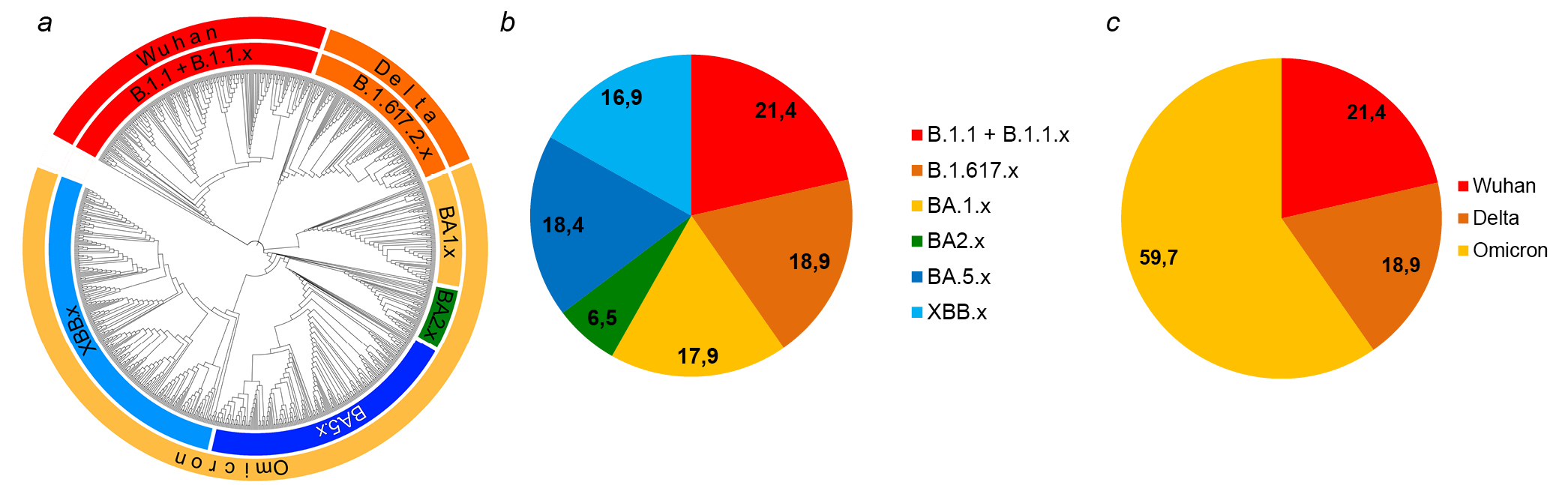 Fig. 1. Genotyping of 804 full-genome SARS-CoV-2 nucleotide sequences identified in Primorsky Krai (2020–2023). a — phylogenetic tree; b — distribution according to Pango genetic lines; c — distributions according to WHO genovariants.