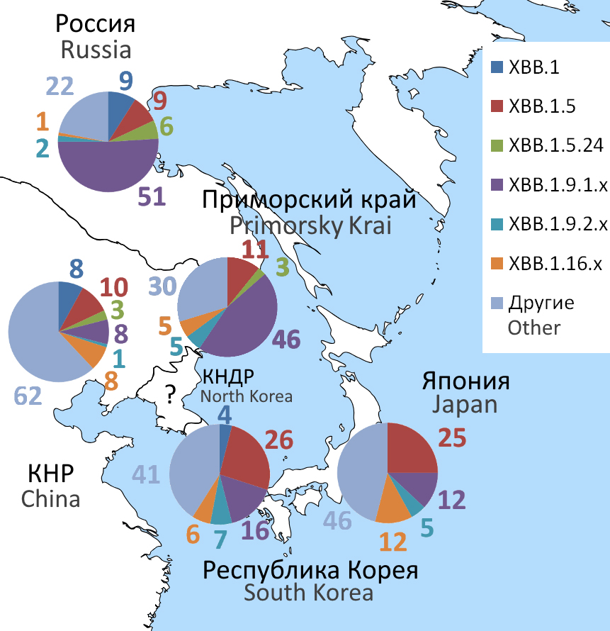 Epidemiological analysis of COVID-19 incidence in PK from 20.04.2020 to 30.06.2023 was based on data from the Department of Rospotrebnadzor for Primorsky Krai, the Centre for Hygiene and Epidemiology in Primorsky Krai1, in Russia — on data from the official website of Rospotrebnadzor2 and the Russian information portal Stopcoronavirus3. Information on the distribution of genetic variants of SARS-CoV-2 in Russia was used from the review and analytical work [17, 19] and the Russian database VGARus, in Eastern Asian countries – from the international database GISAID4.
