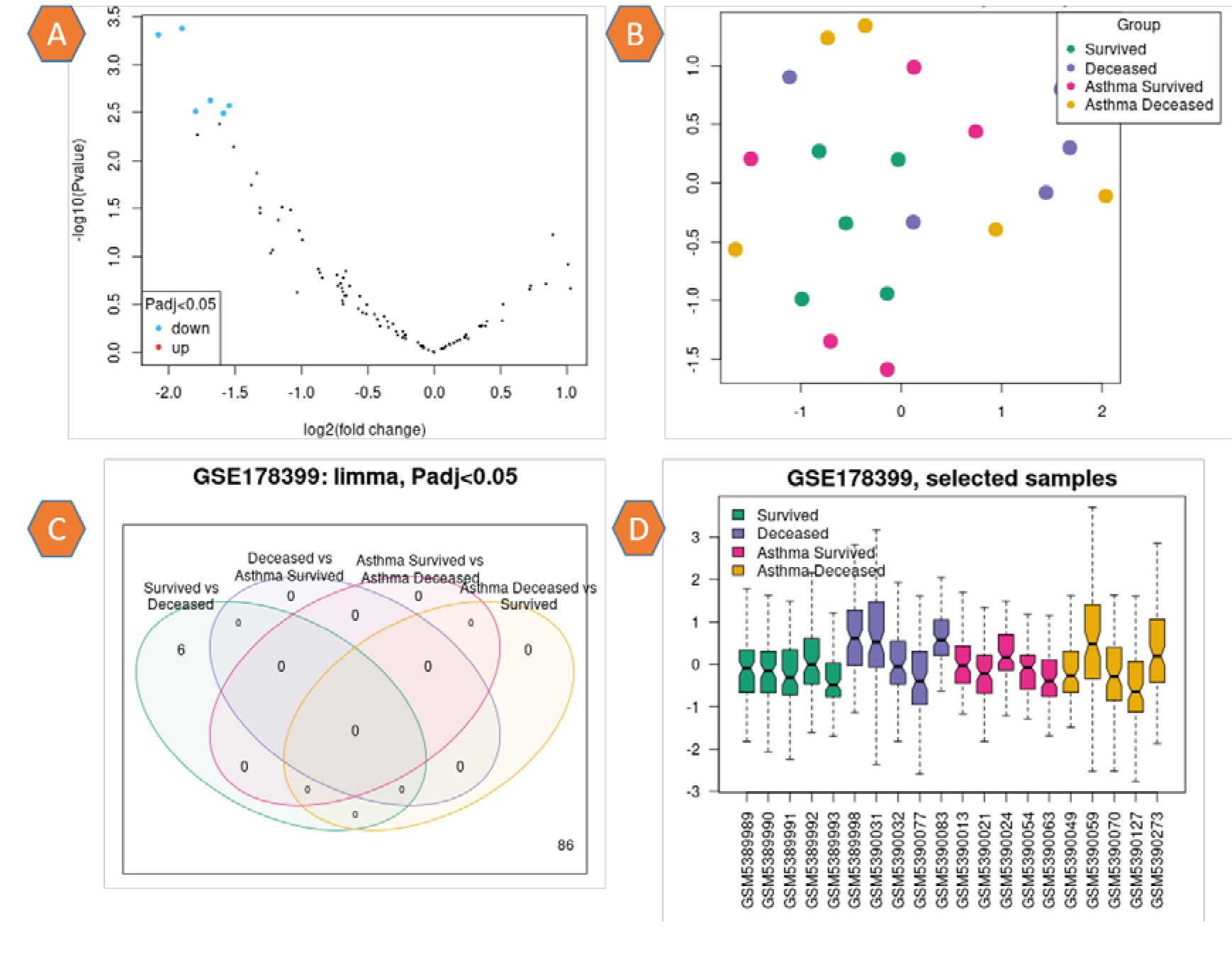 A pilot study was conducted to detect thousands of genes using microarrays in samples оf 288 COVID-19 positive patients. Within this group, there was a subset of individuals who had asthma at varying degrees of severity. From this larger cohort, a specific subset of 20 cases was selected for further analysis. Among these cases, some individuals had unfortunately passed away due to severe asthma, which was characterized by an increased presence of Th2-cells. Another separate subset comprised individuals with asthma in a moderate state, who had managed to overcome both COVID-19 and asthma with relatively few complications. These distinct subgroups were then compared to individuals who did not have asthma. This comparison included individuals who had died from COVID-19 as well as those who had successfully recovered from the disease. The experimental study was carried out to detect thousands of genes using microarray. Gene expression data from DNA microarray or other sources is the input. Key features include data pre-processing, data exploration, differential expression analysis, pathway analysis, and data visualization [14]. The information about the patients was retrieved and analyzed from the gene expression omnibus (GEO) with the ID (GSE178399) [15]. 20 patient profiles were chosen for the investigation, as shown in Table 1. The PCR tests for SARS-CoV-2 were positive for all patients. Patients were categorized into the following four groups: non-asthma patients survived, non-asthma patients deceased, asthma patients survived, and asthma patients deceased.