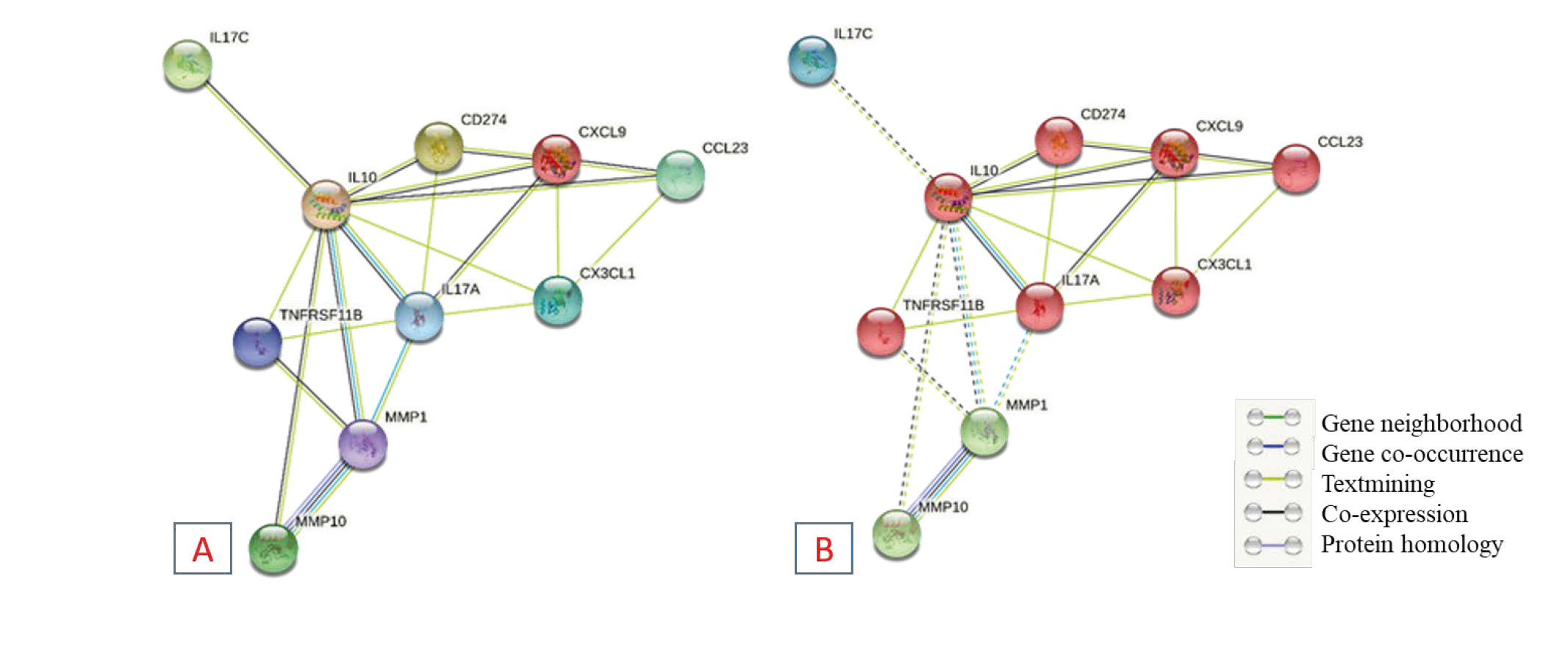 According to the criterion of P < 0.05, ten genes (MMP10, TNFRSF11B, CCL23, CD274, CX3CL1, IL17C, MMP1, IL10, CXCL9, and IL17A) were identified as being associated with an increased risk and warranting further investigation. Heat maps illustrating the relationship between these shared genes based on sample expression revealed that a large proportion of the genes with down-regulated expression were shared (Fig. 5). The type and strength of the relationship between the 10 immune genes are depicted in Fig. 6, a. Seven of ten genes were shown to have a distinct cumulative association after clustering, as shown in Fig. 6, b. Proteins whose gene expression is associated across a wide range of tests. Figure 7 illustrates coexpression scores based on protein co-regulation and RNA expression patterns. Proteins that coexpress the 10 genes under study are associated in a way that is distinct from that seen in other organisms. Figure 8 depicts a phylogenetic tree of the 10 immune-correlated immune genes. Clade Coverage for collapsed groupings of genomes in the phylogenetic tree shows the lowest and highest similarity within that clade as two different hues. Each gene of interest has a color corresponding to the similarity of its best hit inside a specific STRING genome. Interactions can be predicted based on the correlations between these presence/absence profiles. Gene co-occurrence of the correlated gene families with comparable occurrence patterns across genomes is shown in Fig. 9.