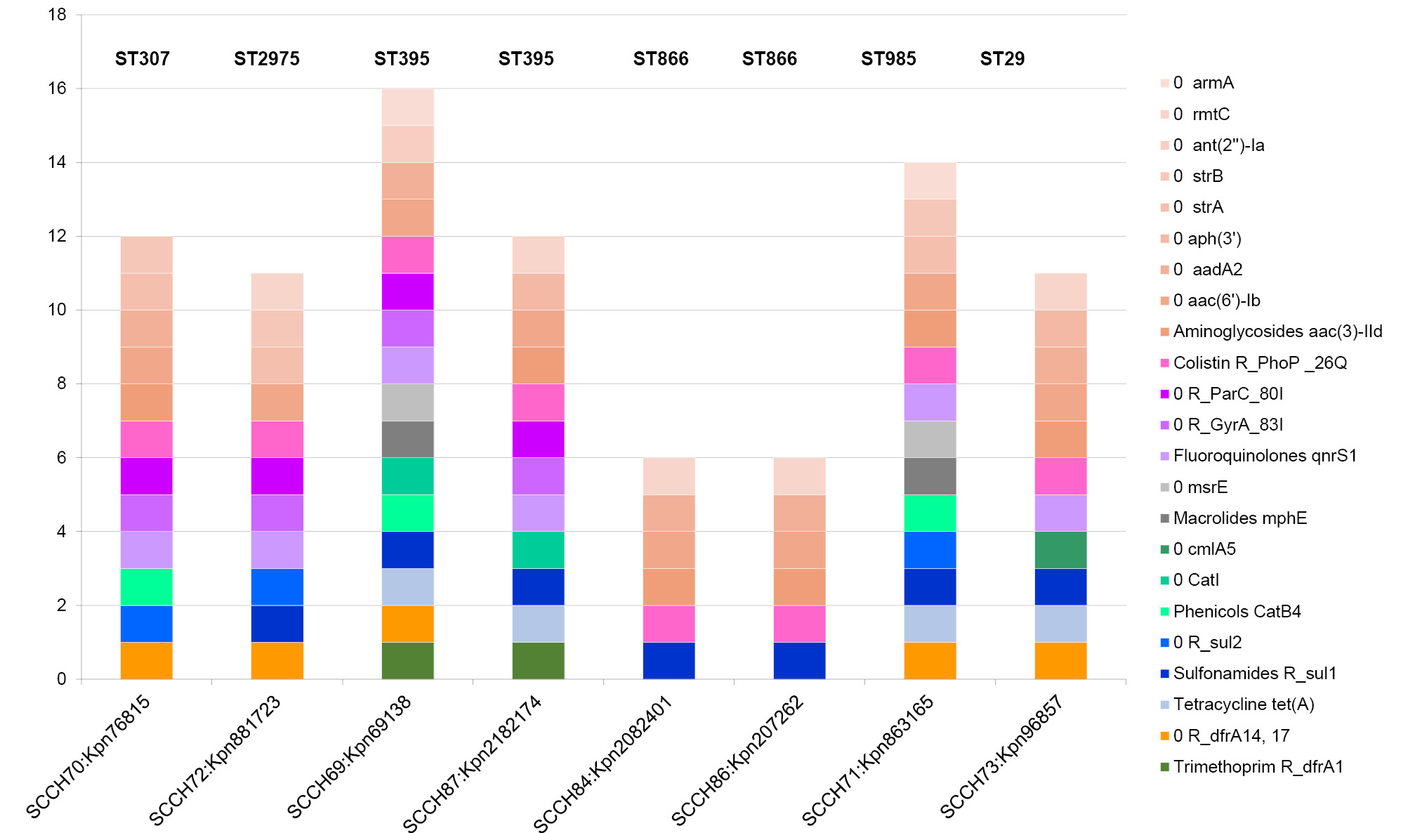 To identify resistance mechanisms and analyze virulence factors, 8 isolates were examined by whole-genome sequencing.