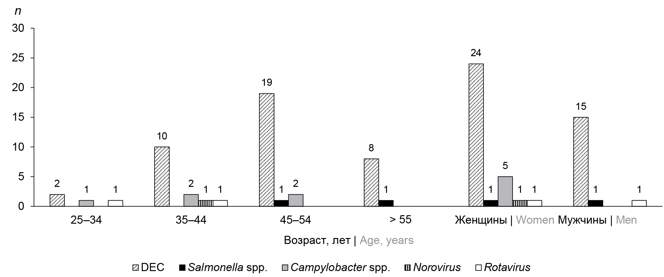 When analysing the distribution of the examined individuals by sex and age, significant differences were revealed (Figure). The main pathogens of acute intestinal infections in HIV-infected men and women were DEC. Thermophilic Campylobacter spp. were identified only in women; no significant differences were found with regard to other studied acute intestinal infection pathogens of bacterial and viral etiology Bacterial pathogens were identified in all age groups, viral pathogens — only in the groups of 25–34 and 35–44 year olds. In the age group of 25–34 years, diarrheal syndrome was caused by bacterial and viral etiology without dominance of a particular pathogen. In the age groups 35–44, 45–54 years and 55 years and older, DEC was a significantly more frequent pathogen of acute intestinal infection (p < 0.05), other bacterial and viral infections were detected without significant differences (p > 0.05).