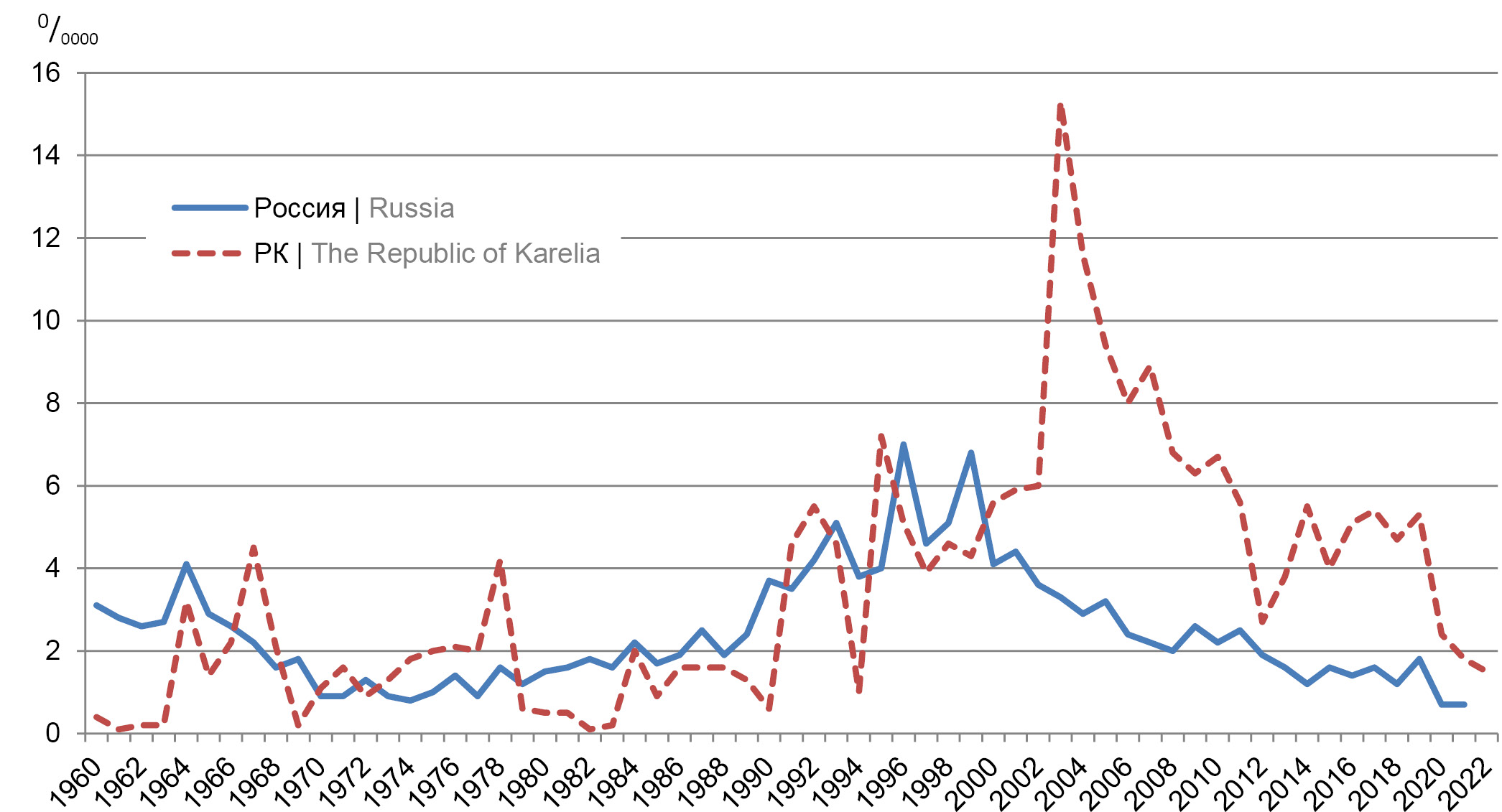Fig. 2. The incidence of tick-borne encephalitis in the population of the Russian Federation and the Republic of Karelia in 1960–2022 (per 100 thousand population).