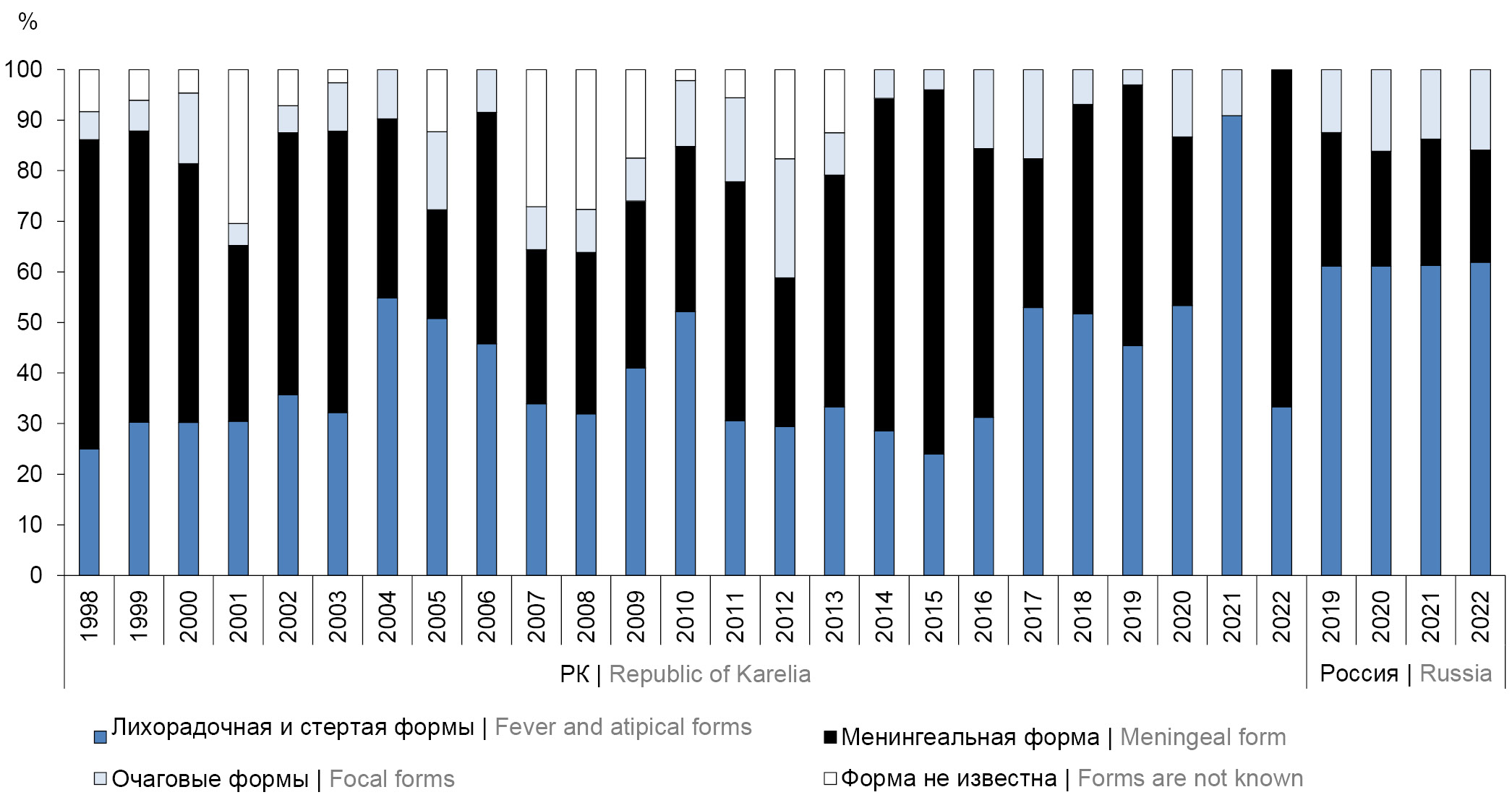 Fig. 3. Structure of clinical forms of tick-borne encephalitis in the Republic of Karelia in 1998–2022 and in Russia in 2019–2022 (%).