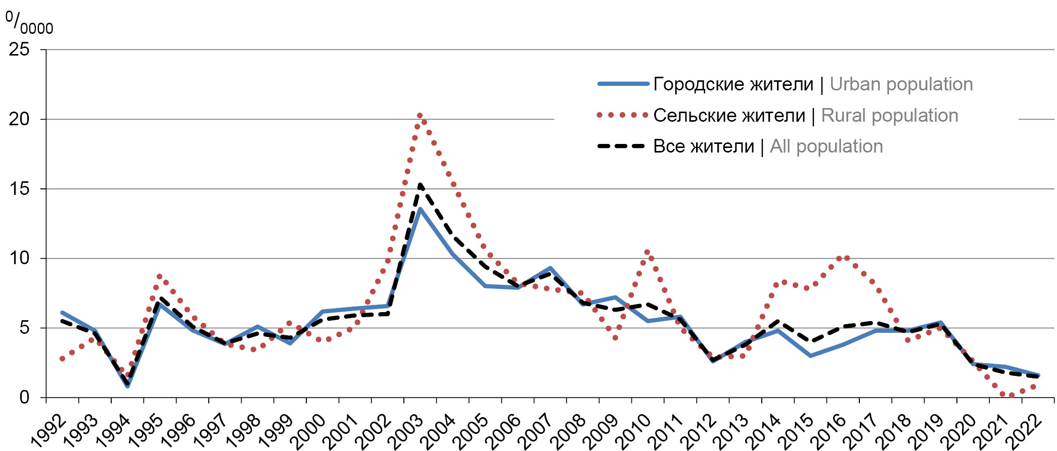 Fig. 4. The incidence of tick-borne encephalitis in the urban and rural population of the Republic of Karelia in 1992–2022 (per 100 thousand).
