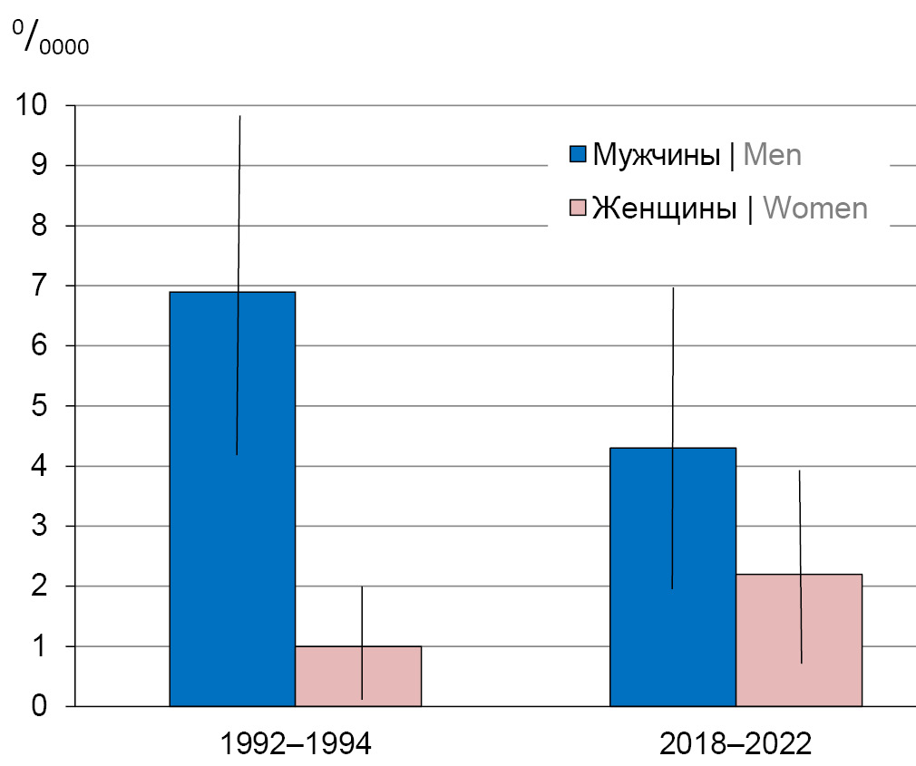 Fig. 5. The incidence of tick-borne encephalitis in men and women in the Republic of Karelia in 1992–1994 and in 2018–2022.