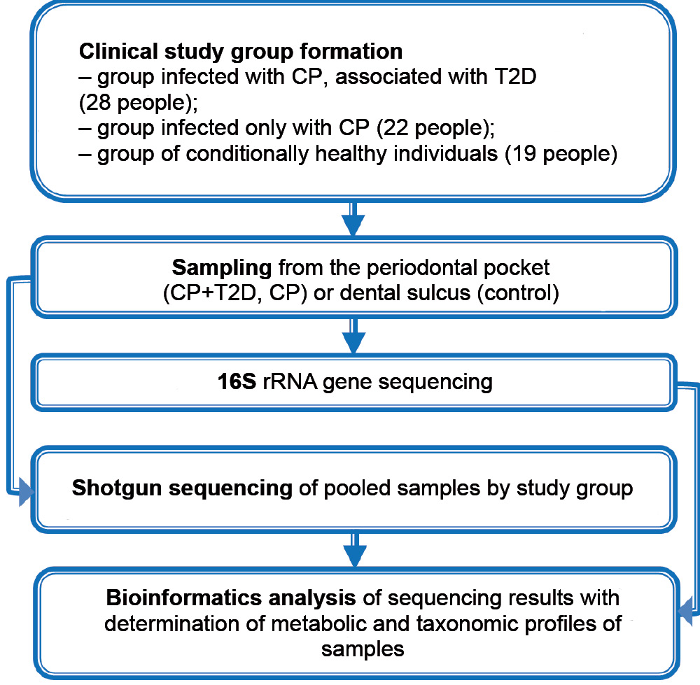 Due to the necessity of using pooled samples of biological material for metagenomic studies, the maximum homogeneity of the study groups was a requirement; therefore, patients with mild and severe course of pathological processes were excluded from the study, in other words, all patients under study had a moderately severe course of the diseases. Patients did not receive treatment for CP during the last 6 months. Among patients with T2D, 11 patients received insulin therapy, 13 patients — oral sugar-lowering drugs, 4 patients — combined therapy, which was taken into account when distributing the samples for further pooling.