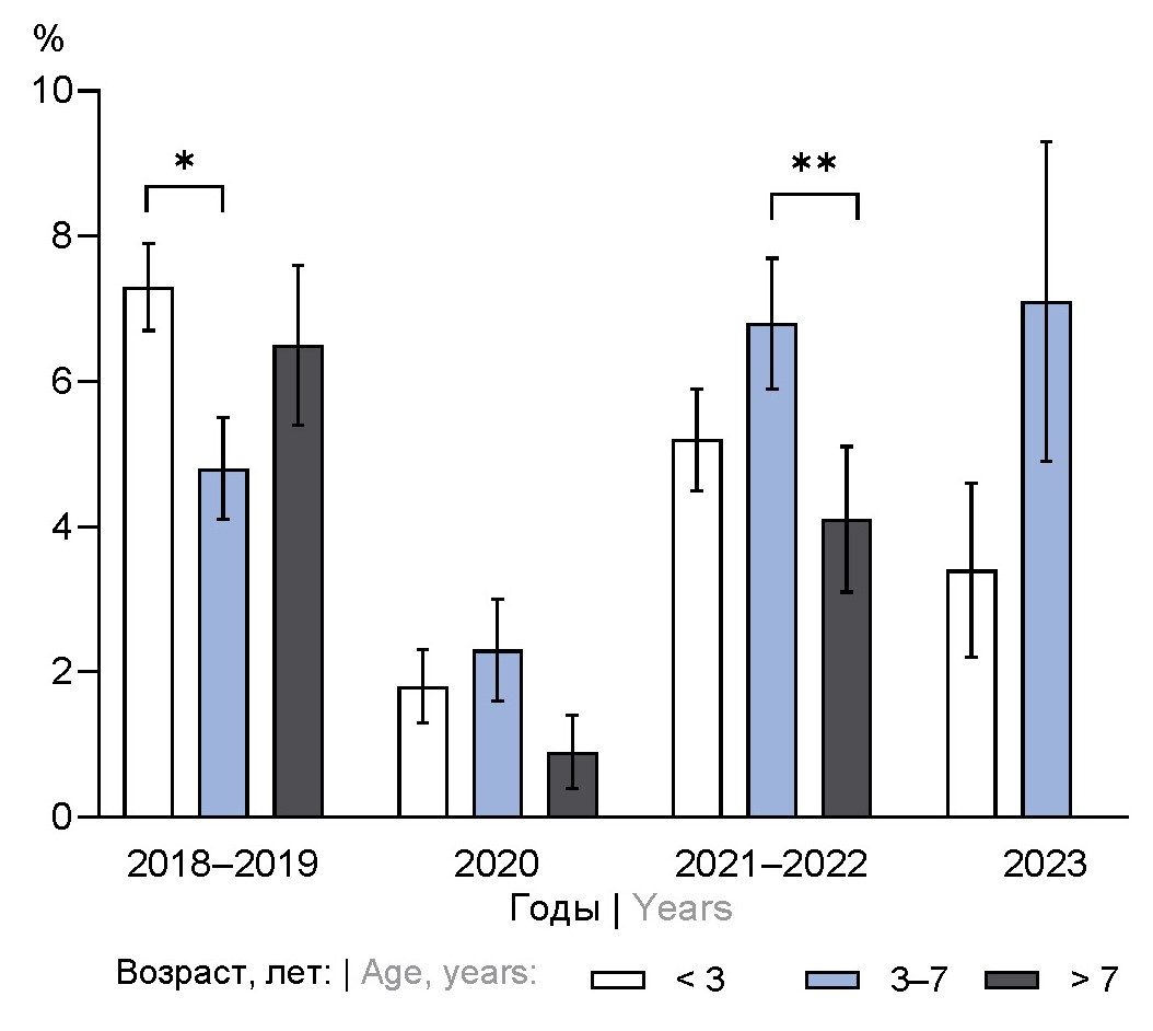 Children of all ages are susceptible to NPEV infection. At the same time, the frequency of EV detection in patients with AII differed in different age groups during the study period (Fig. 3). Thus, prior to the COVID-19 pandemic, EVs were significantly more frequently detected in children under 3 years of age (7.3 ± 0.6%; 120/1644; p = 0.006739), whereas in 2021-2022, EVs were most frequently detected in children aged 3-7 years (6.8 ± 0.9%; 53/778; p = 0.044991) compared to children older than 7 years. In 2020 and 2023, against a background of low detection rates of EVs in children with AII, no significant group differences were found, with no EVs detected in children over 7 years of age in the 2023 season, despite the fact that the number of children aged 7-17 years examined in 2022 and 2023 differed little (169 and 118, respectively).