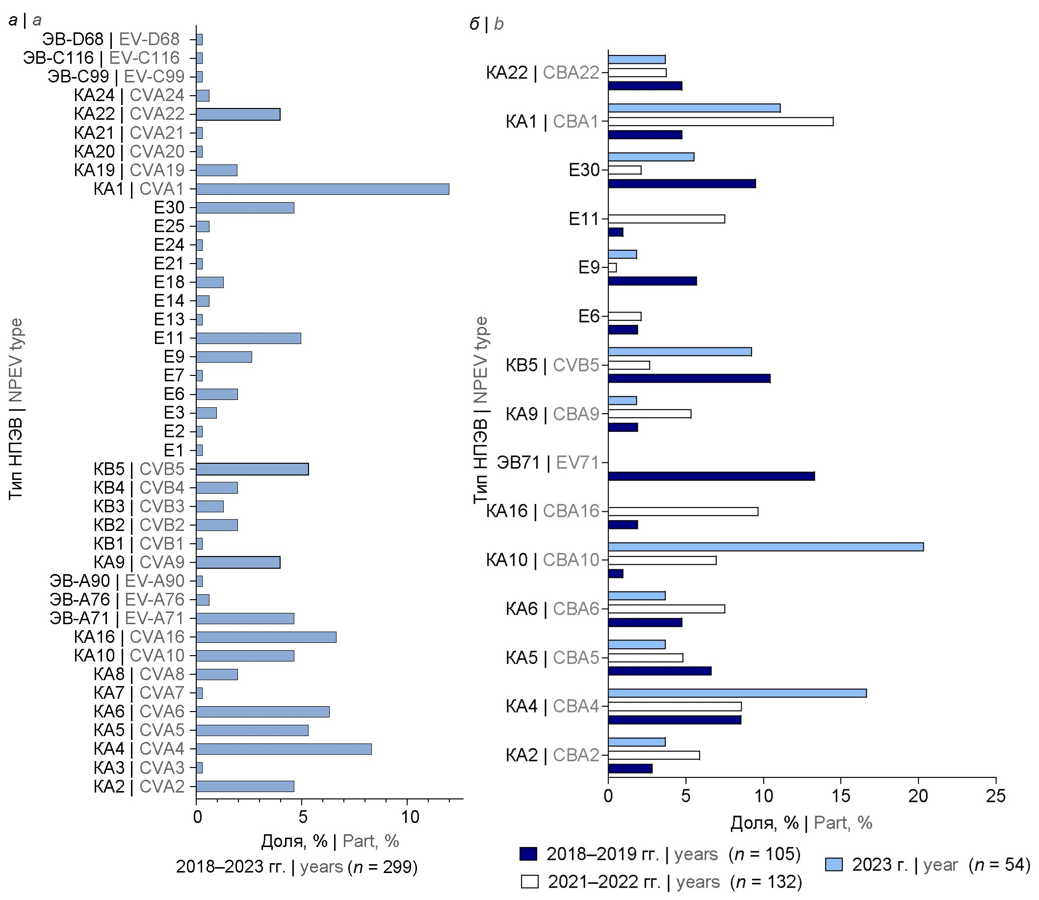 Fig. 4. Diversity of NPEV types identified in children with AII in 2018–2023 (а), before the pandemic (2018–2019), during the pandemic (2021–2022) and after its end (2023) (b).