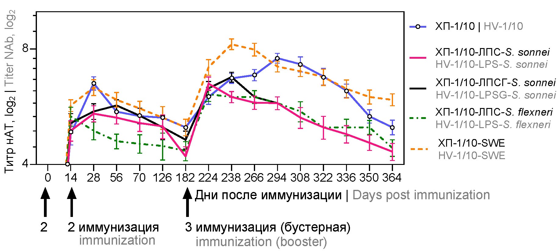 Менее выраженный иммунный ответ ХП-ЛПС-S. flexneri в концентрации 50 мкг/дозу выражался в более отдалённом формировании пика нАТ (к 126-му дню) в сравнении с ХП (на 56-й день). Для ХП-ЛПС-S. flexneri первичный ответ выражался в более значительном повышении уровня нАТ в сыворотке крови морских свинок по сравнению с нативным ХП после первой иммунизации. Бустерное введение препарата приводило к повышению уровня нАТ с формированием повторного пика на 266-й день.