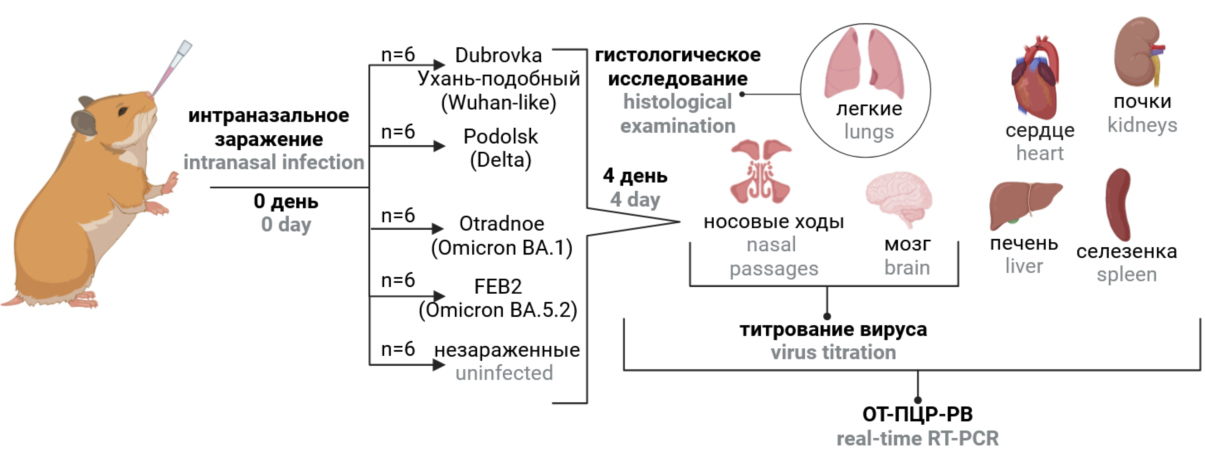 Conclusion. Despite the revealed lower virulence for hamsters of viruses belonging to the Delta and Omicron variants compared to the ancestral Wuhan virus, this animal model for COVID-19 retains its value for conducting preclinical trials of antiviral drugs.