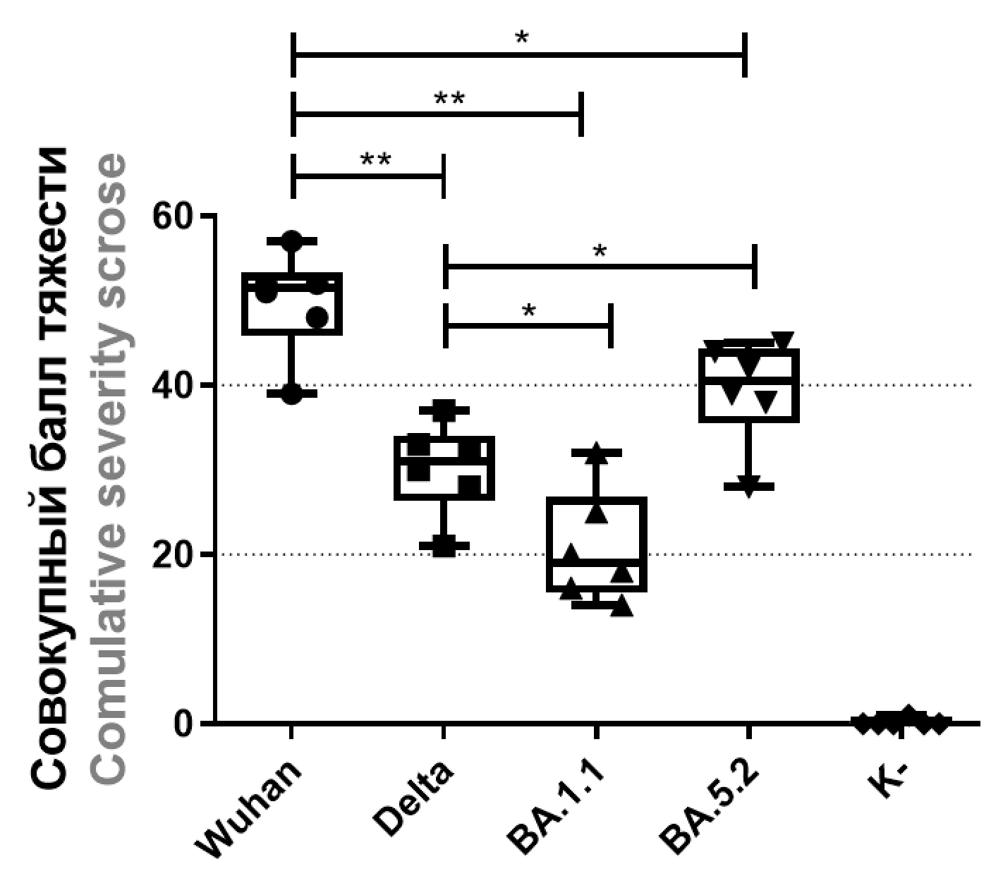 During histologic examination of the lungs of infected and uninfected hamsters, the morphologic manifestations of coronavirus pneumonia were graded using the recommendations of A.D. Gruber et al. [25]. In infected animals, the cumulative score reflecting the severity of the inflammatory process ranged from 20.8 to 49.8, while in uninfected animals it was close to zero (Fig. 3). In the group of animals infected with Wuhan-like virus, the mean value of the cumulative severity score was 50 ± 6, Delta — 30 ± 5, BA.1.1 — 21 ± 7, BA.5.2 — 39 ± 6.