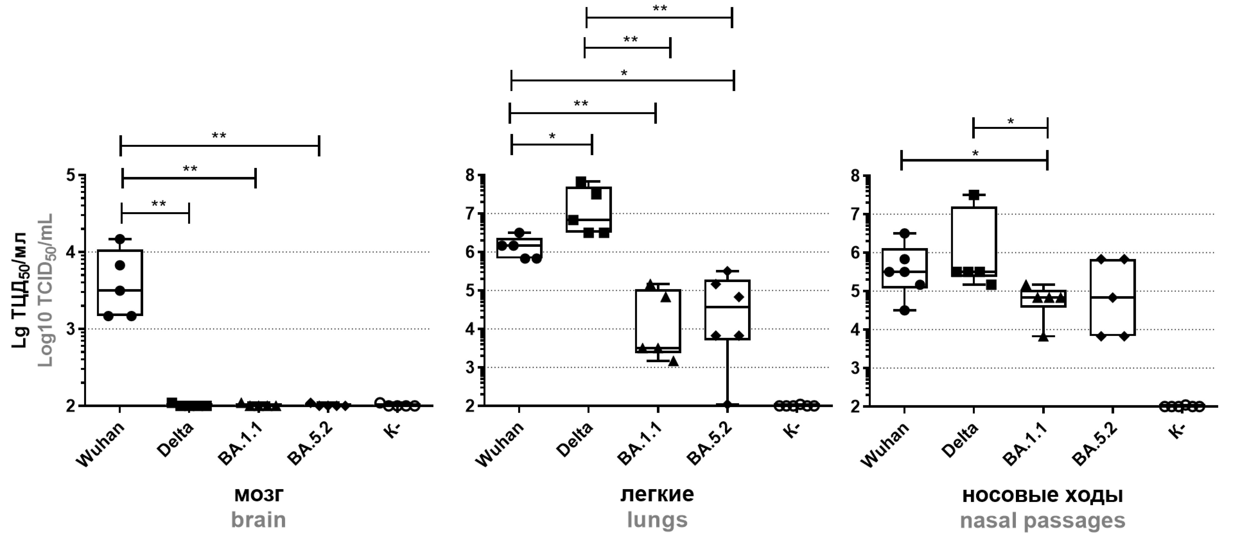 Fig. 5. Titer values of different SARS-CoV-2 strains in the organs of Syrian hamsters on the 4th day after infection. *р < 0.05; **р < 0.01.