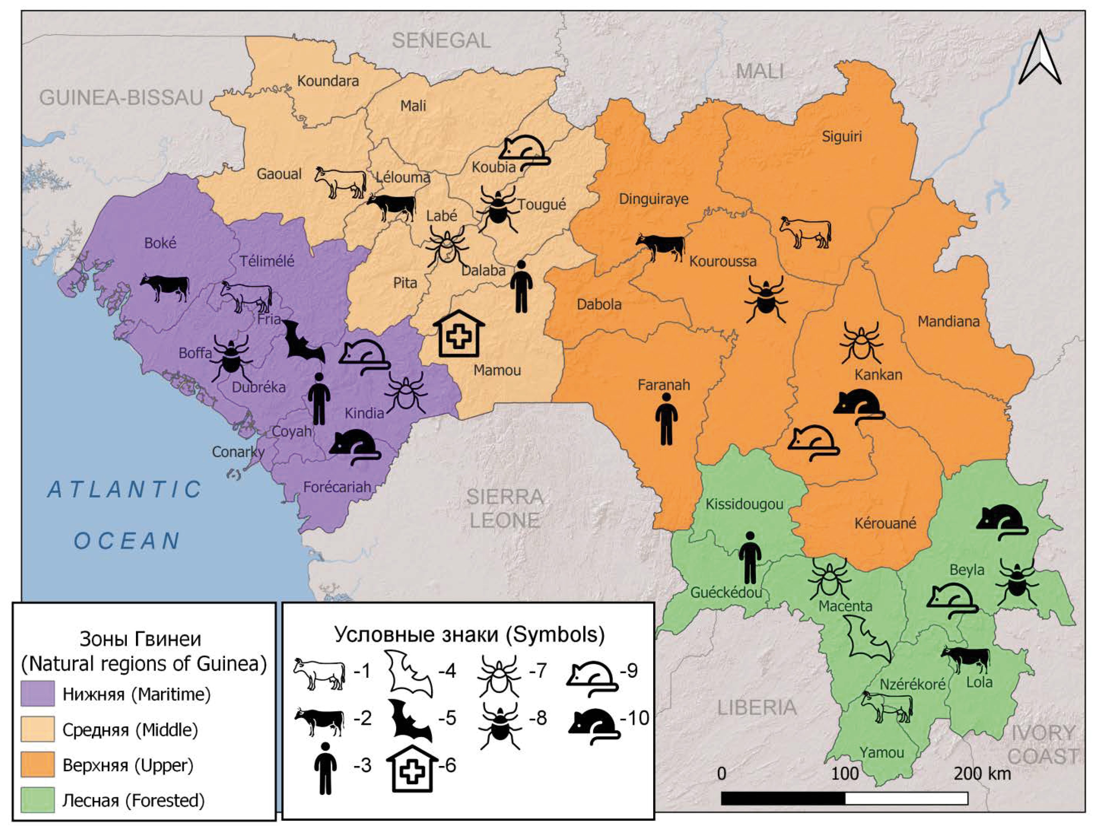 Materials and methods. The study was carried out in the laboratory of the Russian-Guinean Center for Epidemiology and Prevention of Infectious Diseases (Kindia, Republic of Guinea). The study involved 332 sera of febrile patients and 3156 sera from practically healthy volunteers, 1074 blood samples of livestock, 1648 suspensions of ticks, 319 specimens of small mammals and 298 of bats. The study was carried out using ELISA and PCR methods, selected samples were subjected to in-depth genetic analysis.