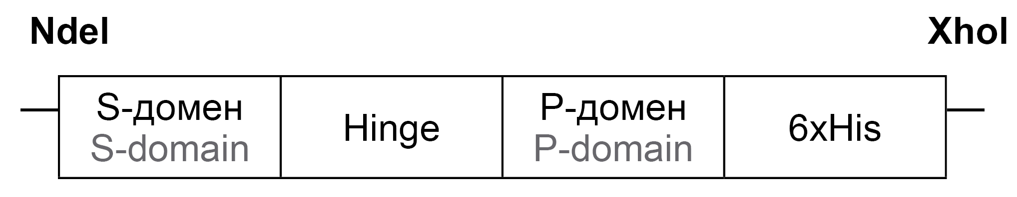 В начало нуклеотидной последовательности, кодирующей белок VP1 эпидемически значимого штамма НВ генотипа GII.4, был внесён сайт для эндонуклеазы рестрикции NdeI. К последовательности, кодирующей С-терминальную часть белка, была добавлена нуклеотидная последовательность, кодирующая 6 гистидинов, стоп-кодон (ТАА) и сайт для рестриктазы XhoI, использованные для последующего молекулярного клонирования. Схематичное строение гена представлено на рис. 1. Полученную последовательность синтезировали в фирме «Евроген». Последовательность, кодирующая VP1, была перенесена в плазмиду pET22b («Thermo Fisher Scientific»), позволяющую с высокой эффективностью экспрессировать рекомбинантные белки в штаммах E. coli, содержащих в геноме DE3 лизоген [8].
