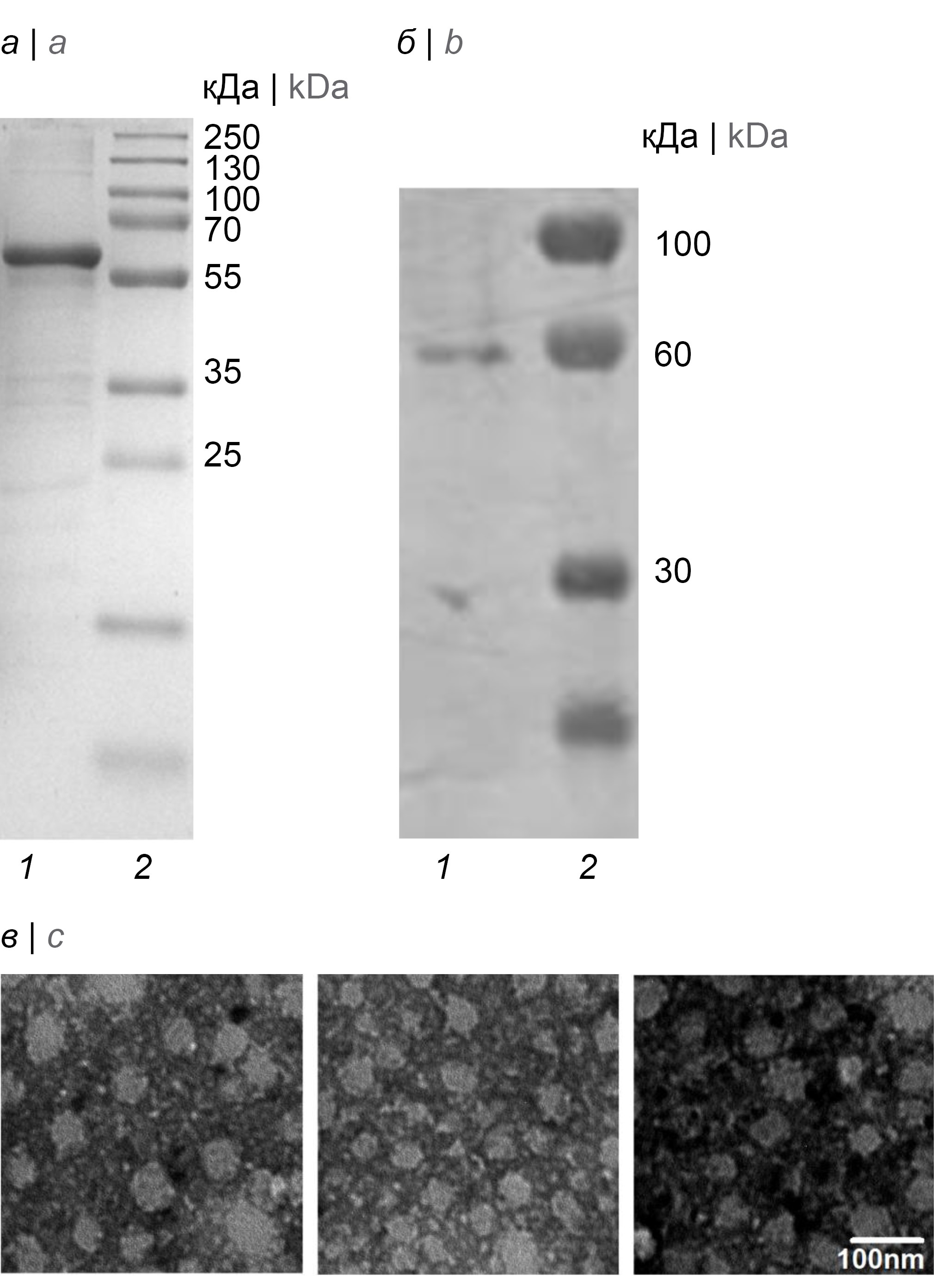 a — electrophoregram of purified norovirus VP1 protein; b — Western-blot of purified norovirus VP1 protein; 1 — VP1; 2 — molecular weight marker; с — electron microscopic photographs of virus-like particles formed by recombinant norovirus VP1. Contrast with 3% uranyl acetate, pH 4.6.