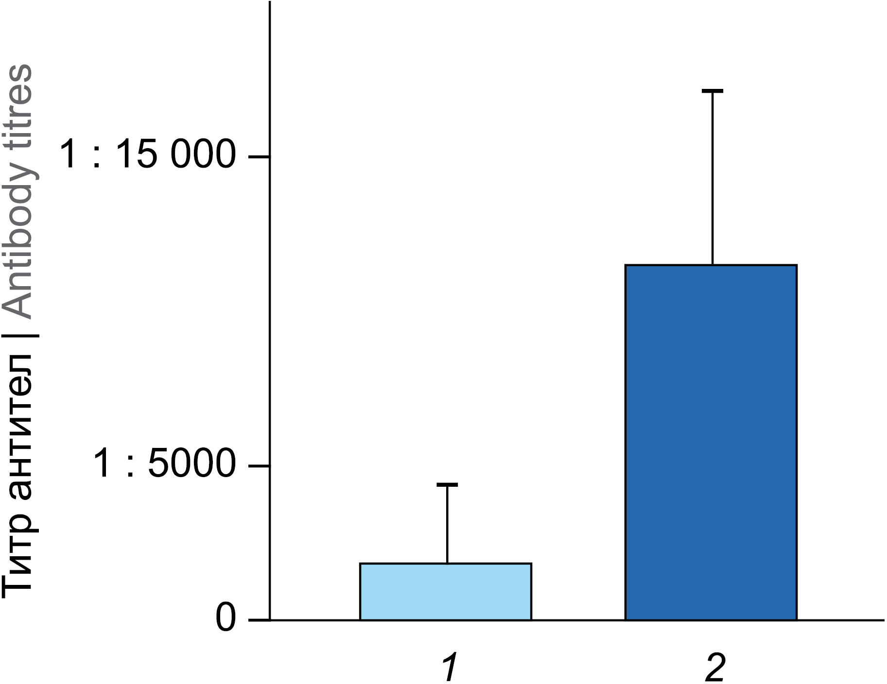 Двукратная внутрибрюшинная иммунизация 10 лабораторных мышей с интервалом в 2 нед и последующим получением сыворотки крови через 3 нед после 2-й иммунизации в дозе 10 мкг (0,5 мл) приводила к образованию в крови животных АТ против VP1 НВ. АТ в крови животных обнаруживались в титрах от 1 : 1024 до 1 : 4096, средний титр составил величину, равную 1 : 1536. Иммунизация животных той же дозой белка по той же схеме, но в смеси с 100 мг гидроокиси алюминия вызвала появление АТ к VP1 НВ в титрах до 1 : 32 768. В среднем титр АТ был равен 1 : 13 720, что почти на порядок превышало титры АТ у животных, иммунизированных без гидроокиси алюминия (рис. 3). Таким образом, показано, что полученный рекомбинантный белок способен вызвать выраженный антительный ответ, значительно повышающийся в присутствии использованного адъюванта.