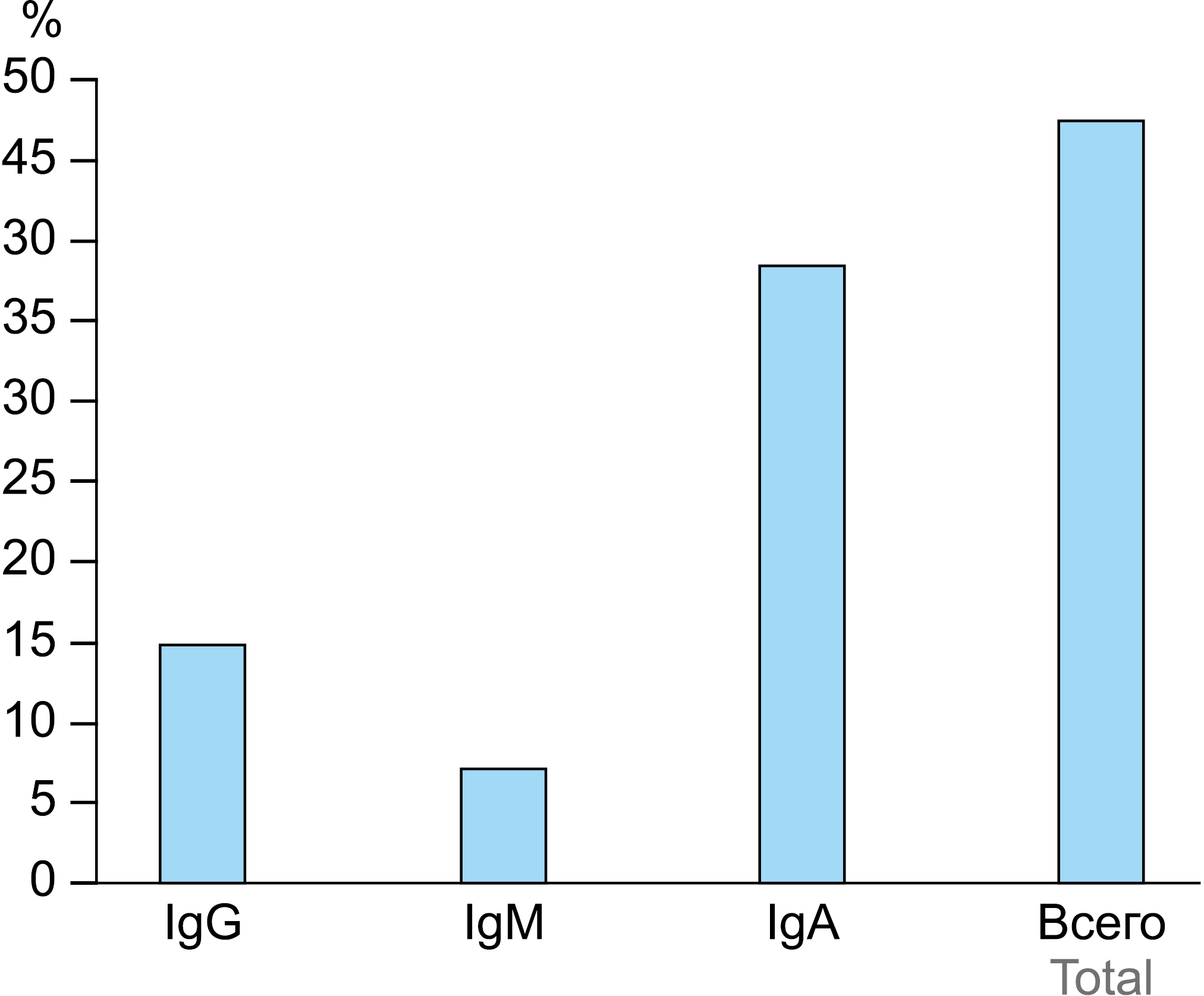 Поскольку НВ широко циркулирует среди населения, закономерно ожидать наличие АТ к его белкам в крови людей. Проведена оценка наличия АТ разных классов к полученному рекомбинантному белку в крови лиц, проживающих в средней полосе России. Определяли частоту обнаружения АТ к VP1 в образцах плазмы крови 637 волонтёров. Как следует из рис. 4, АТ класса IgG обнаруживались у 14,8% волонтёров, АТ класса IgM — у 7,1%, АТ класса IgА — у 38,5%. Суммарная встречаемость АТ составила 47,4%.