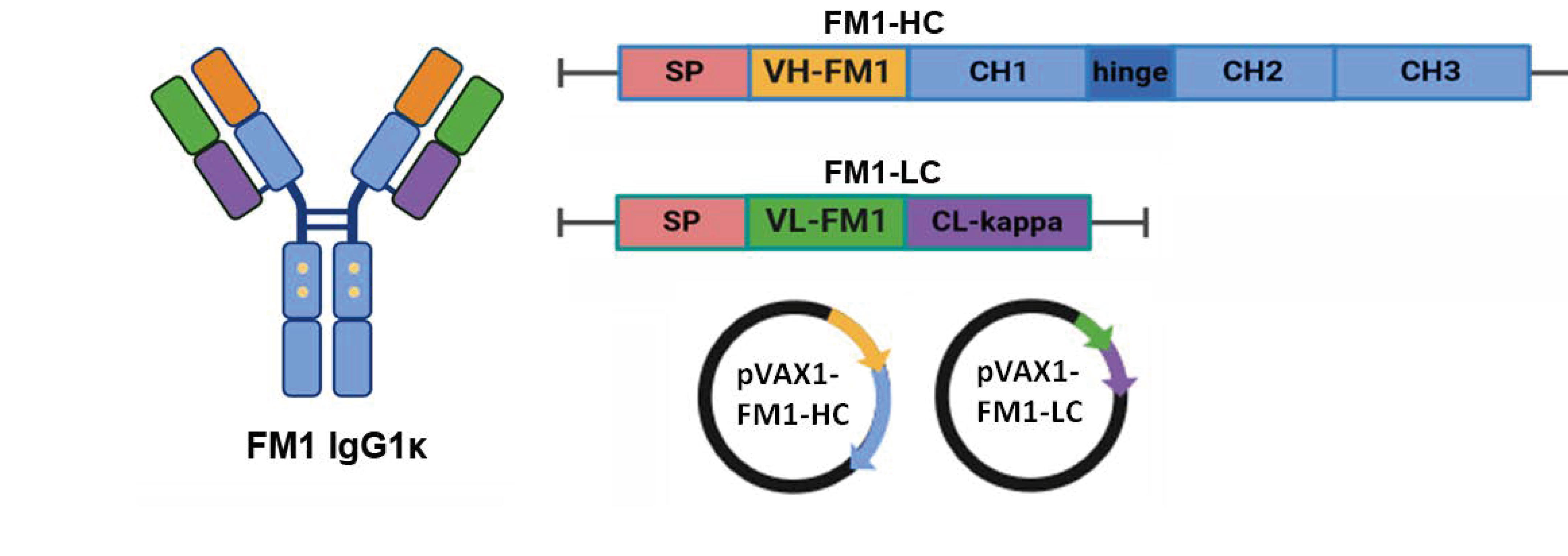 Design and generation of expression constructs encoding recombinant FM1 antibody