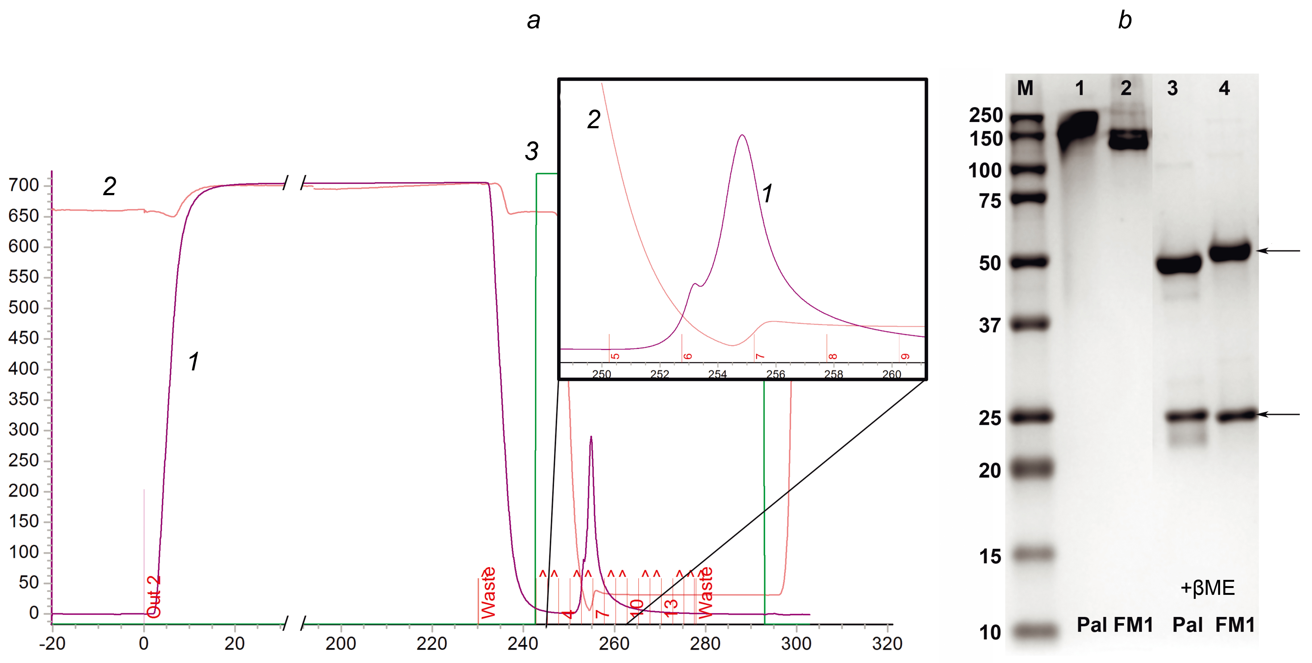 b — the results of the electrophoresis in PAAG of the purified FM1 drug compared with the control drug palivizumab (Pal). The preparations were applied in non-reduced (tracks 1 and 2) and reduced conditions (tracks 3 and 4; βME — β-mercaptoethanol). M — molecular weight marker (Bio-Rad). On tracks 3 and 4 there are visible zones corresponding to electrophoretic mobility of recombinant antibody heavy (HC)and light (LC) chains. The gel was colored by Coomassie colloidal solution and processing using the Gel Doc EZ Imager (Bio-Rad).