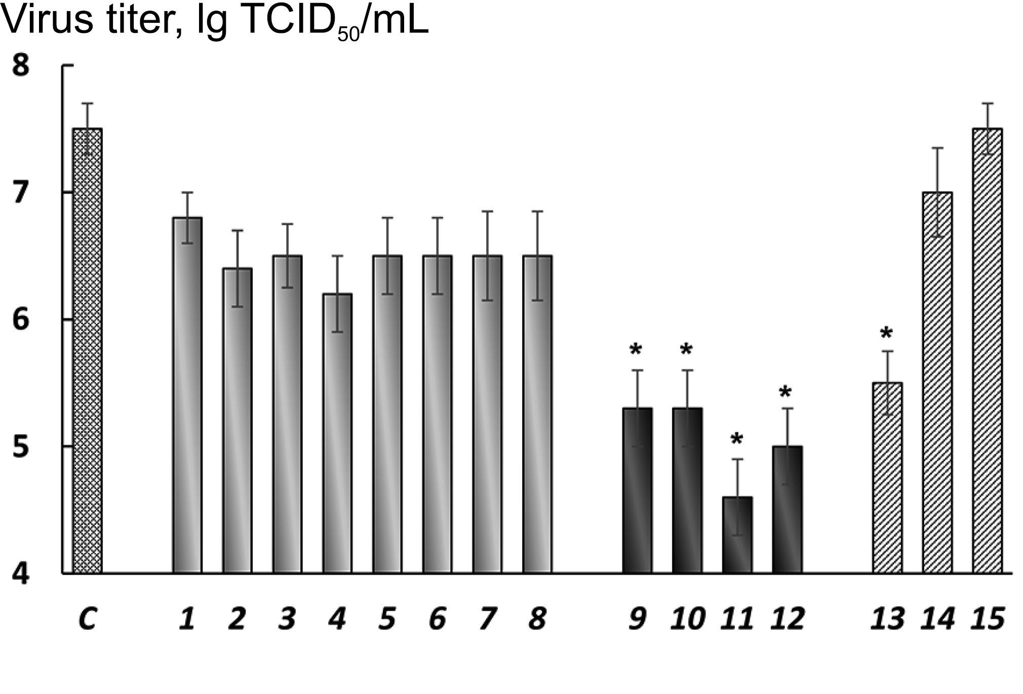 Statistical analysis was performed using the Statistica v. 12 program (StatSoft Inc.). Virus titer in control and experiment (without or with experimental samples, respectively) was calculated using the Spearman–Kerber method and expressed as lg TCID50/mL. Differences between the results with experimental and control samples were considered significant at p ≤ 0.05.