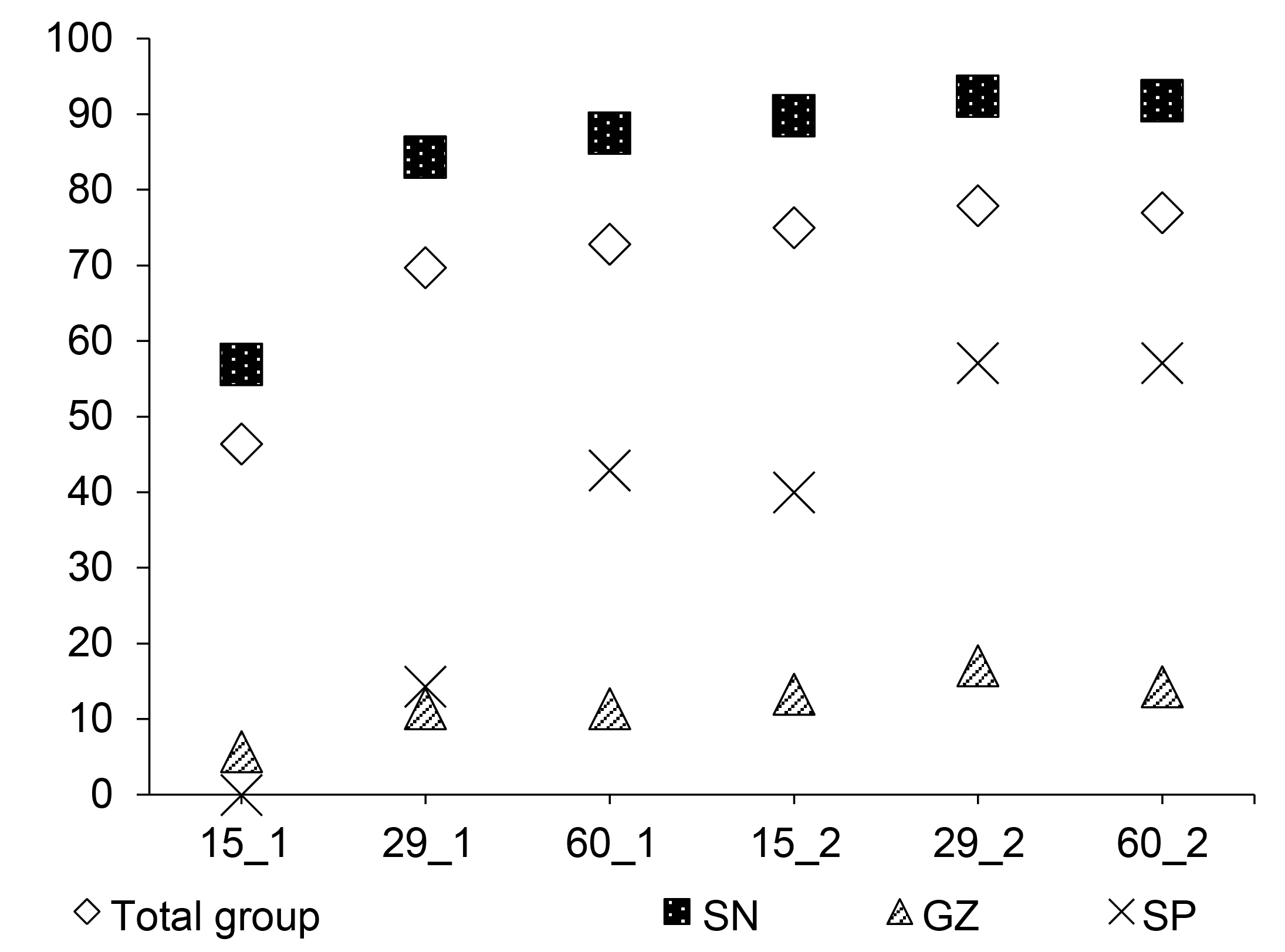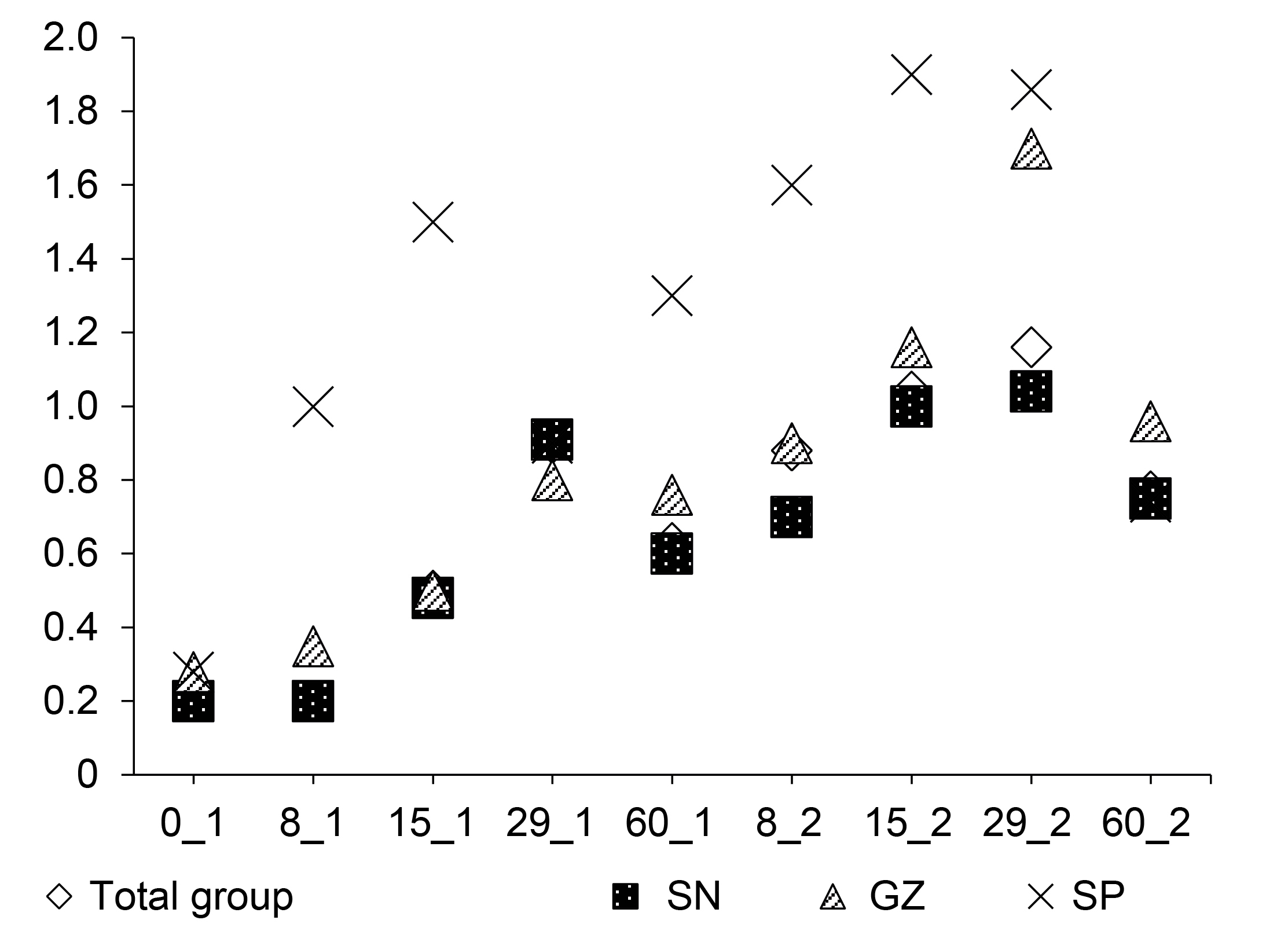 The dynamics of the level of secretory IgA antibodies was similar to that of IgA antibodies in serum. Highly significant differences (p < 0.0001) between the vaccinated and placebo groups were detected from day 15 after the 1st vaccine injection. The proportion of volunteers with a twofold increase in IgA antibody levels on days 15, 29 and 60 after the 1st administration and on days 8, 15, 29 and 60 after the 2nd vaccine administration was 58.4, 71.6, 70.8, 80.2, 82.6, 84.0 and 73.5%, respectively. There were no significant differences between the SN, GZ and SP subgroups, except for one point, 29 days after the 2nd vaccine administration, at which the SN and SP subgroups differed significantly (p = 0.031).