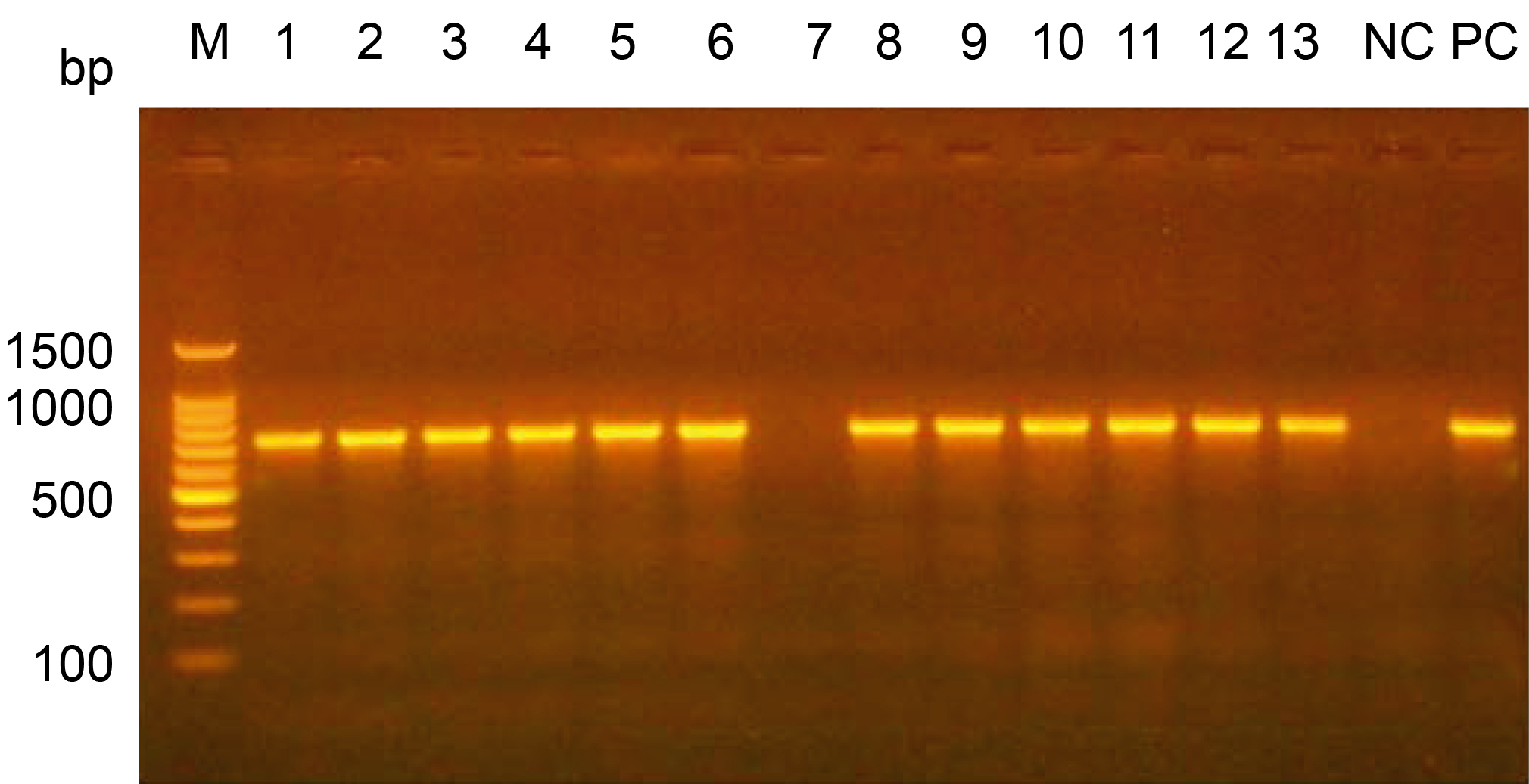Electrophoresis of PCR product for atr gene on agarose gel. Lane M represents 100 bp DNA ladder, every lane (1–13) except lane 7 represented positive results. Lanes NC and PC represented negative and positive controls respectively.