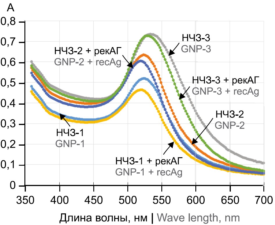 Конъюгаты НЧЗ с рекАГ получали, добавляя по каплям 10 мл раствора НЧЗ с рН 8,0 к раствору рекАГ до концентрации рекАГ 25 мкг/мл для НЧЗ-1, до 30 мкг/мл для НЧЗ-2 и до 40 мкг/мл для НЧЗ-3. Далее смесь встряхивали при комнатной температуре в течение 30 мин на приборе «Multi-Reax» («Heildorf»), вносили 10% раствор бычьего сывороточного альбумина (БСА; «Sigma») до конечной концентрации 0,25% и инкубировали 15 мин в прежних условиях. Затем раствор центрифугировали 30 мин при 4ºС и скорости 8–11 тыс. об/мин в зависимости от размера НЧЗ. Осадок суспендировали в 1 мл фосфатного буфера с 0,1% БСА, 10% сахарозы и 0,01% азида натрия и регистрировали спектры поглощения. Полученные конъюгаты НЧЗ с рекАГ хранили при 4ºС.