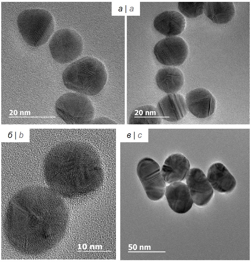 Величина среднего размера частиц, оцененная с помощью просвечивающей электронной микроскопии, составила 16, 25 и 41 нм для НЧЗ-1, НЧЗ-2 и НЧЗ-3 соответственно, что хорошо согласовывалось со значениями, заданным условиями синтеза, и свидетельствовало о высокой технологичности и воспроизводимости использованного метода.