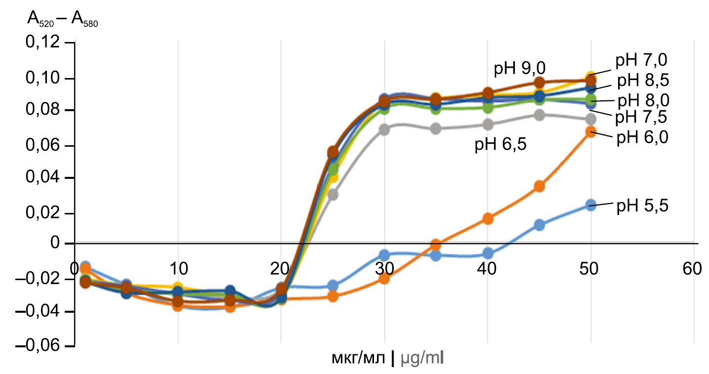 С целью получения устойчивого золя были оптимизированы условия адсорбции рекАГ на поверхности НЧЗ с учётом физико-химических свойств белка: молекулярной массы, растворимости, изоэлектрической точки (pI = 5,43) и концентрации, стабилизирующей коллоидную систему. Стабилизирующую концентрацию белка определяли в интервале значений рН 5,5–9,0 для НЧЗ всех трех размеров. На рис. 4 в качестве примера представлены кривые зависимости показателя А520 – А580 от концентрации белка при различных значениях рН для НЧЗ-2.