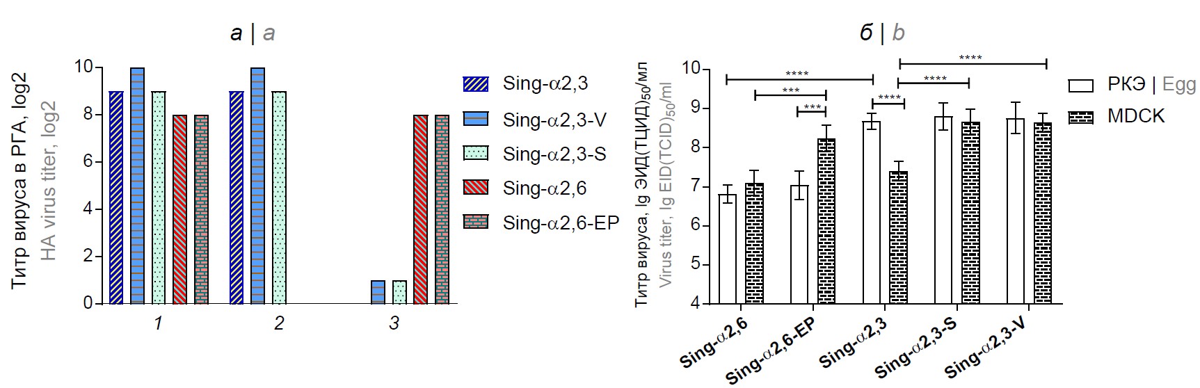 Для подтверждения этой гипотезы мы сконструировали методами обратной генетики 2 штамма живой гриппозной вакцины H2N2 на основе донора аттенуации А/Ленинград/134/17/57: А/17/Singapore/57/1 с генами HA и NA от вируса Sing-α2,3 (обозначен как 17/Sing-α2,3) и А/17/Singapore/57/2 с генами HA и NA от вируса Sing-α2,6 (17/Sing-α2,6). РГА с различными эритроцитами подтвердило рецепторную специфичность полученных вакцинных вирусов, которая совпадала с соответствующим диким вирусом (рис. 4, а), что ещё раз указывает на ключевую роль НА в связывании с гликановыми рецепторами клетки-хозяина. Важно отметить, что адаптация вакцинных штаммов к клеткам MDCK не привела к появлению новых мутаций в молекуле НА: более 50 накопленных из бляшек вирусов соответствовали исходному штамму ЖГВ. Оценка инфекционной активности сконструированных вирусов показала, что вакцинные штаммы 17/Sing-α2,3 и 17/Sing-α2,6 одинаково хорошо размножались в культуре клеток MDCK, тогда как в РКЭ вирус 17/Sing-α2,3 имел инфекционный титр на порядок выше, чем у вируса 17/Sing-α2,6 (рис. 4, б).