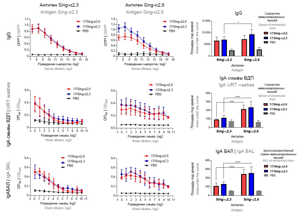 Слева представлены значения ОП450 при различных разведениях сывороток или смывов с ВДП и бронхоальвеолярного лаважа к вирусу Sing-α2,3 в ИФА. Посередине представлены значения ОП450 при различных разведениях сывороток или смывов к вирусу Sing-α2,6 в ИФА. Справа — значения площади под кривой ОП при длине волны 450 нм в ИФА с соответствующим антигеном.