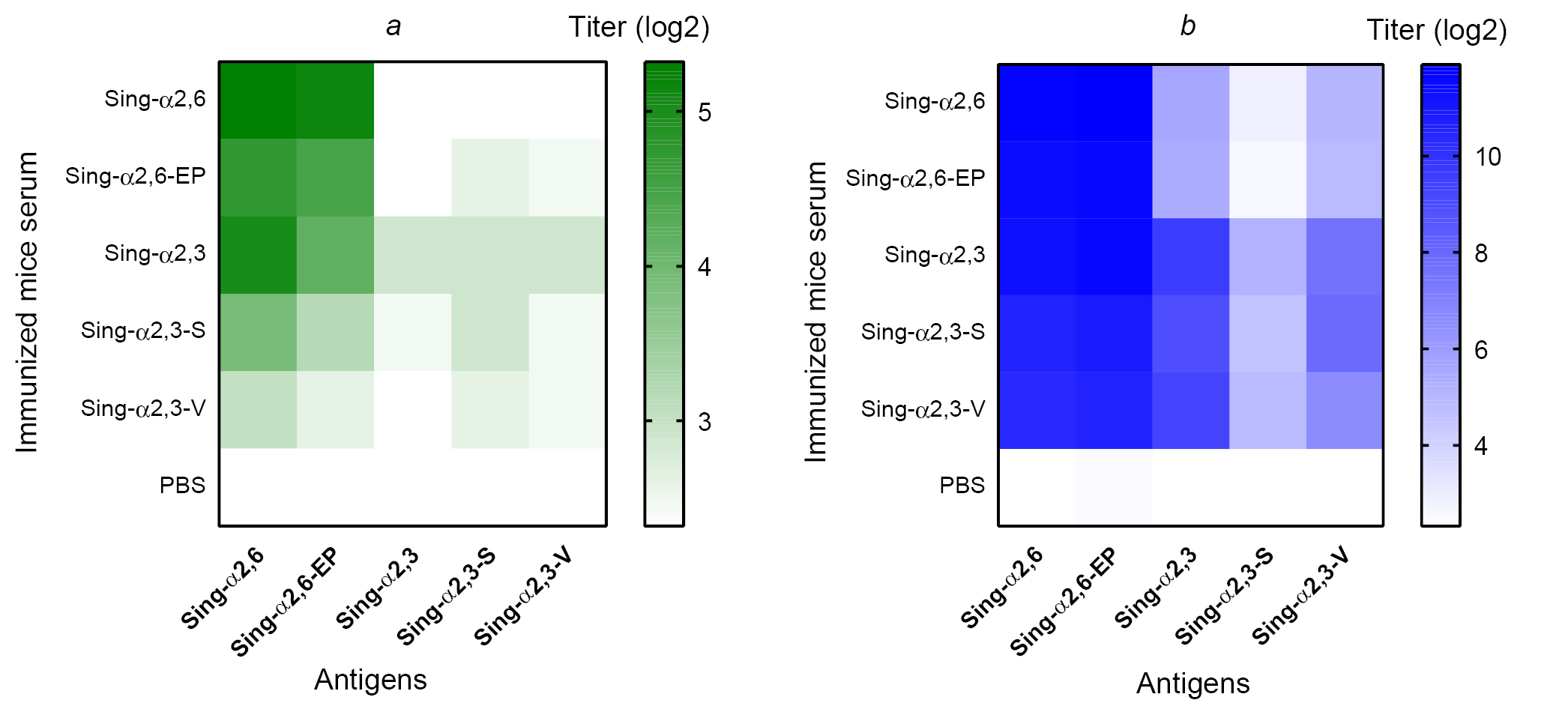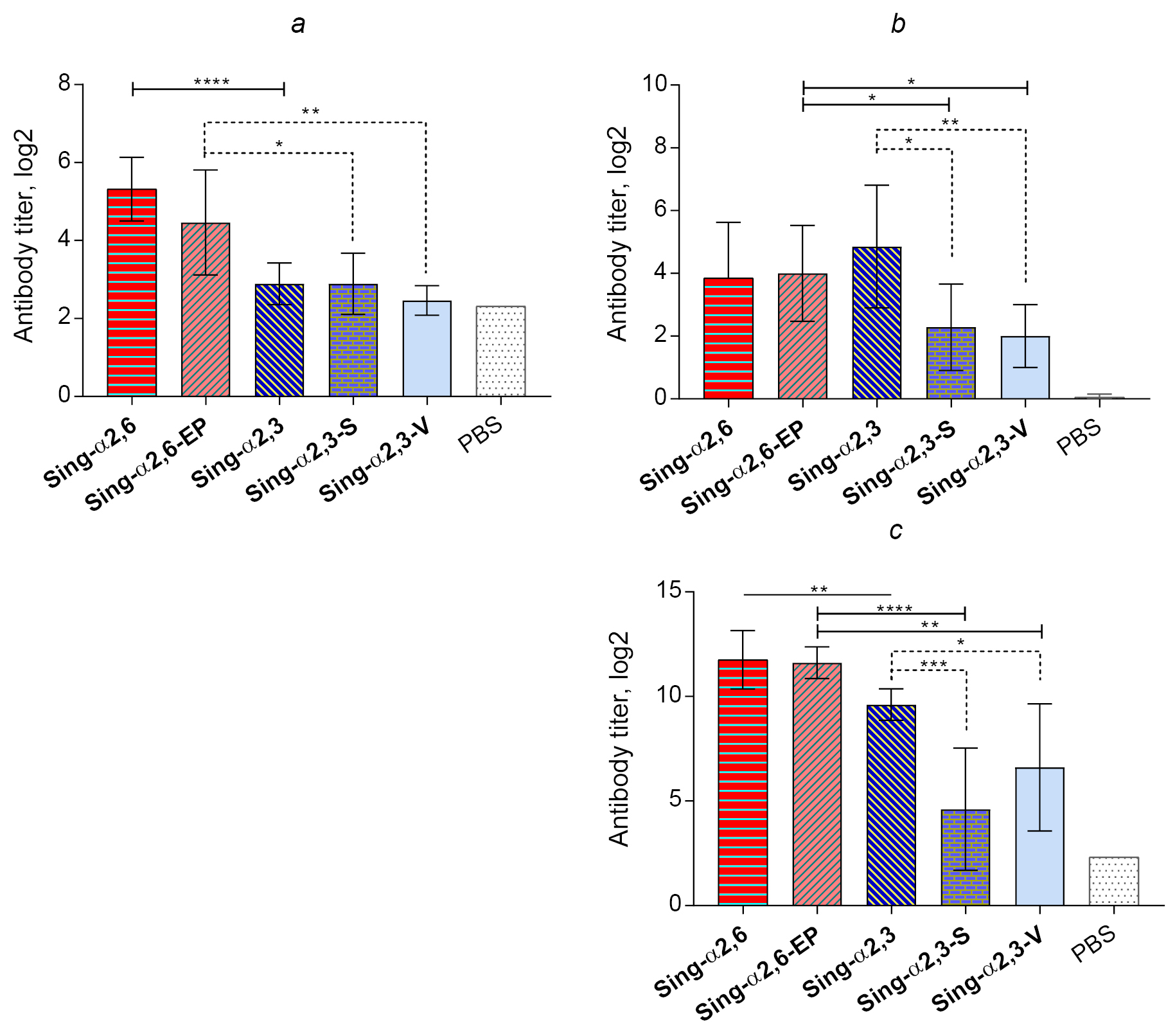 Далее была проведена оценка кросс-реактивности сывороточных антител, выработанных при введении 5 исследованных вариантов вируса А/Singapore/1/57 (H2N2), в отношении каждого варианта в РТГА и ИФА. Интересно, что при использовании в качестве антигенов в РТГА вирусов с α2-6-рецепторной специфичностью выявлялись существенно более высокие показатели титров антител во всех иммунизированных группах, по сравнению с антигенами, обладающими α2-3-специфичностью (рис. 3, а). При этом антитела в сыворотках группы Sing-α2,6 не уловили ни один из 3 вариантов вирусов с α2-3-рецепторной специфичностью. Несмотря на то что у мышей, иммунизированных MDCK-адаптированным вариантом Sing-α2,6-EP, выявлялись титры антител выше уровня детекции, статистически значимых отличий с группой контроля не обнаружено. Исследование кросс-реактивности сывороточных IgG-антител методом ИФА показало схожие результаты: вирусы с α2-6-рецепторной специфичностью в качестве антигенов выявляли наиболее высокие значения титров антител во всех группах, тогда как связывание антител с вирусами с α2,3-рецепторной специфичностью было значительно слабее у животных всех групп (рис. 3, б).