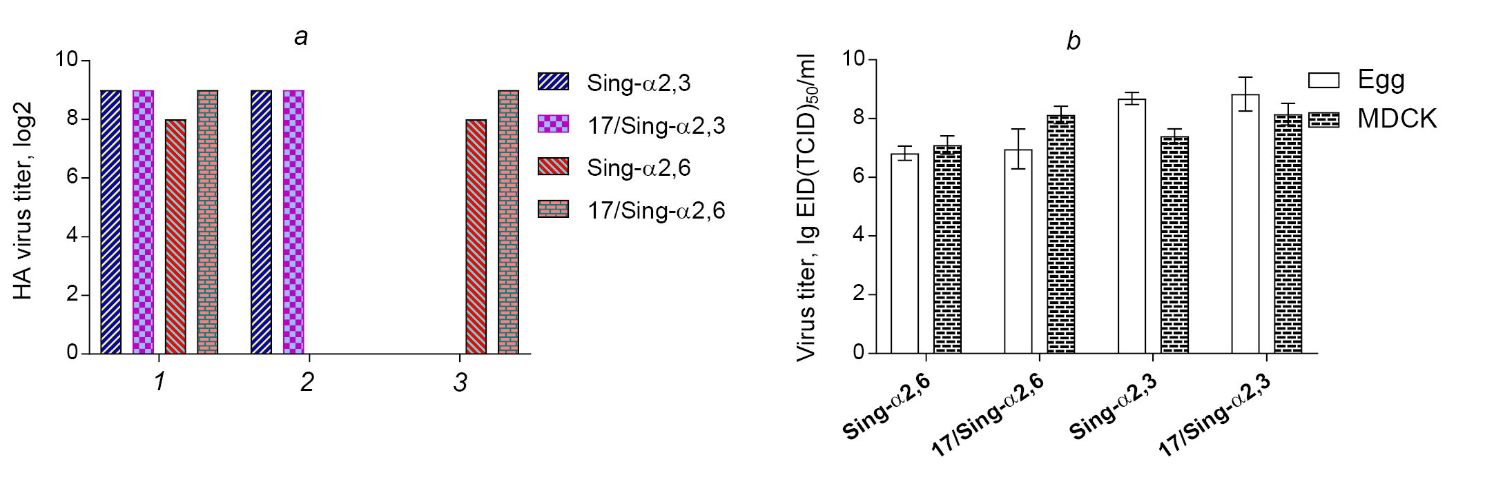 a — titers of viruses in HA with untreated chicken erythrocytes (1), horse erythrocytes (2) and chicken erythrocytes treated with exosialidase (3); b — infectious activity of the studied viruses in the Egg and MDCK cells.