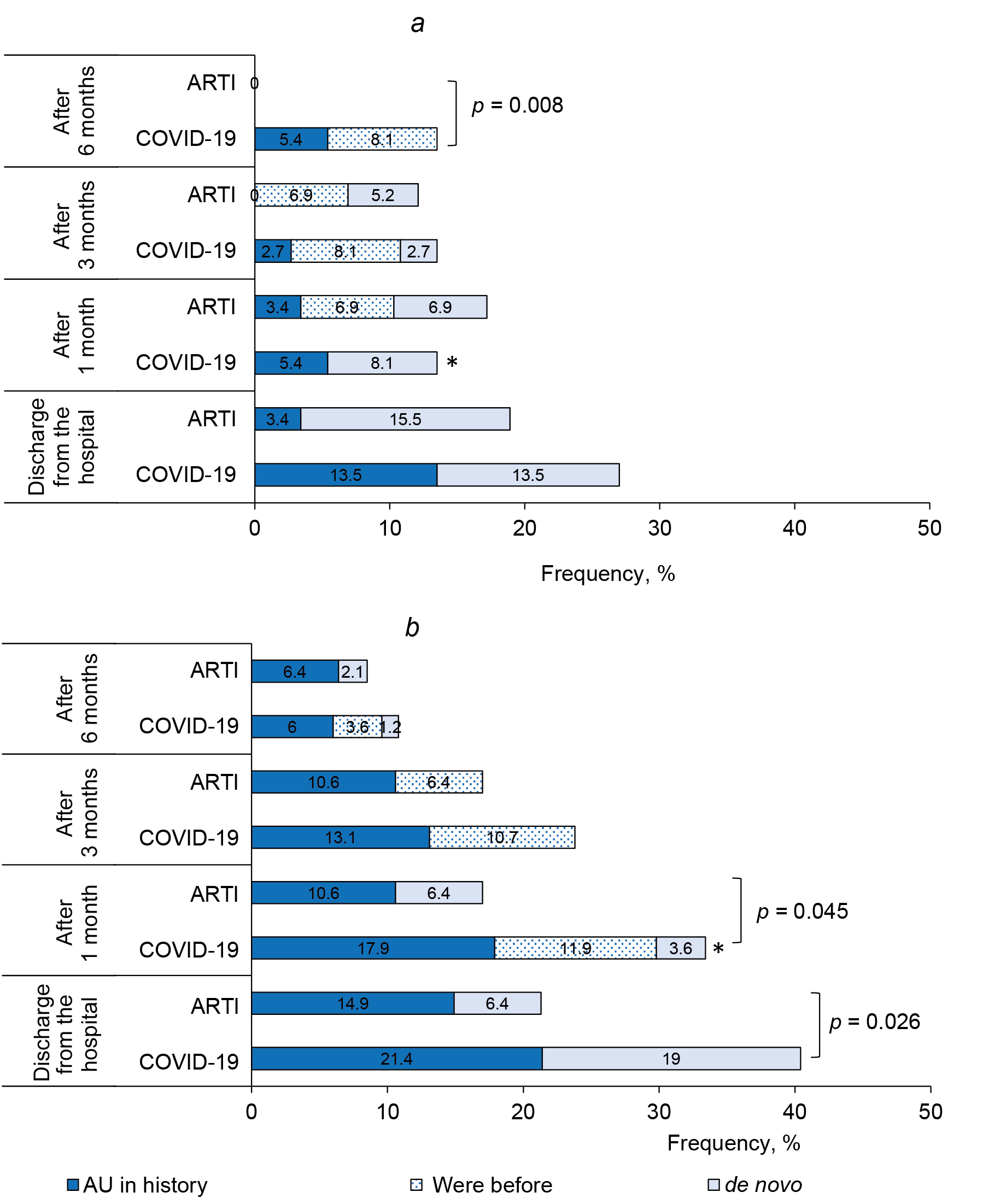 Psychoemotional disorders de novo in relation to the previous time point, n (%) | COVID-19 ARTI | 1 (2.7) – | 2 (5.4) 6 (10.3) | 4 (10.9) 3 (5.2) | 1 (2.7) – | – – | – – |