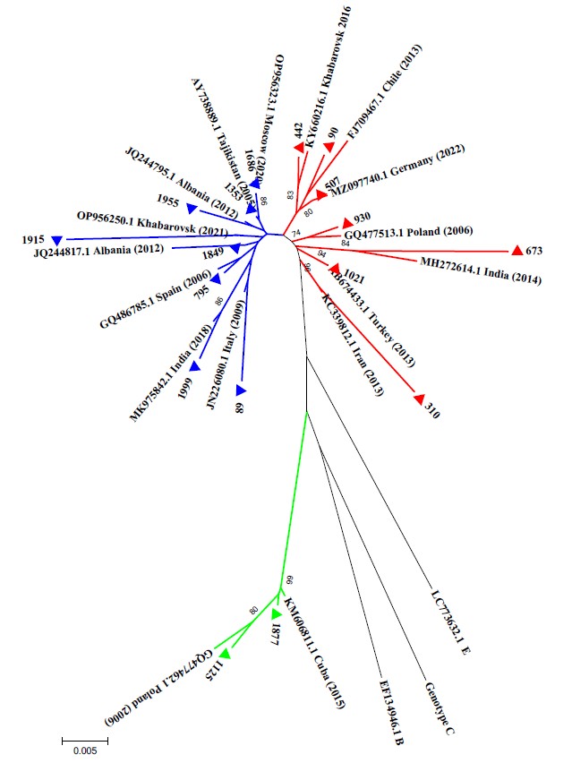 Филогенетическое дерево построено с помощью метода ближайших соседей. Последовательности HBV, изученные в данной работе, выделены треугольниками. Референс-последовательности HBV обозначены номерами GenBank. Указаны значения bootstrap-индекса, превышающие 70%. Синие линии — субтип D2; красные — субтип D1; зелёные — субтип А2.