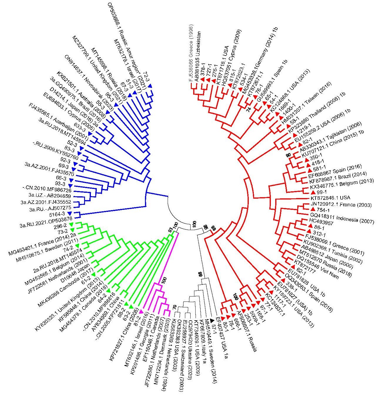 Филогенетическое дерево построено с помощью метода ближайших соседей. Последовательности HBV, изученные в данной работе, выделены треугольниками. Референс-последовательности HBV обозначены номерами GenBank. Указаны значения bootstrap-индекса, превышающие 70%. Синие линии — субтип 3a; красные — субтип 1b; зелёные — субтип 2a; чёрные — субтип 1а; сиреневые — субтип 2с.