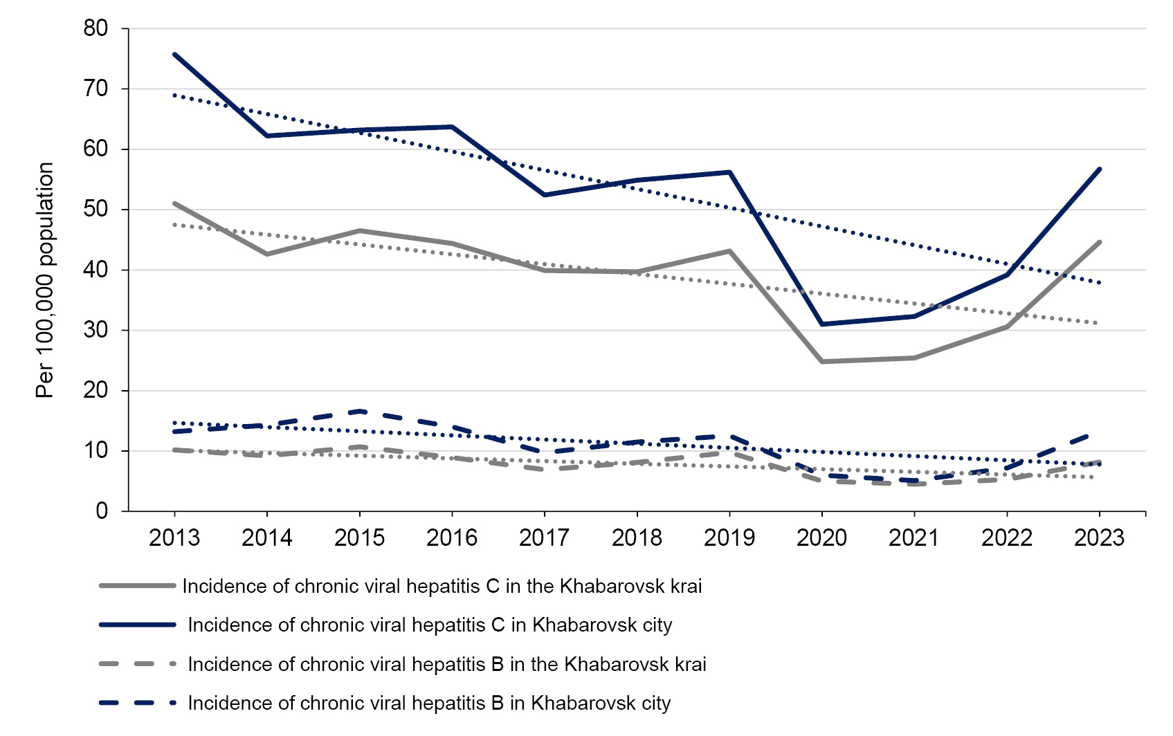 The current epidemiological situation on viral hepatitis both in the Khabarovsk Krai and on average in Russia is characterized by an increase in the total number of patients with chronic forms among the population. In general, in the Khabarovsk Krai for 2013-2023, the curves of chronic hepatitis B and C incidence had unidirectional downward trends. Despite this, the incidence rate of chronic hepatitis C in the Khabarovsk Krai, which reached 44.6 cases per 100,000 population in 2023, exceeded the national average of 31.6 cases per 100,000 population. At the same time, the incidence rate of chronic hepatitis B in the Khabarovsk Krai was slightly lower than the Russian average — 8.2 and 8.4 cases per 100,000 population, respectively8.