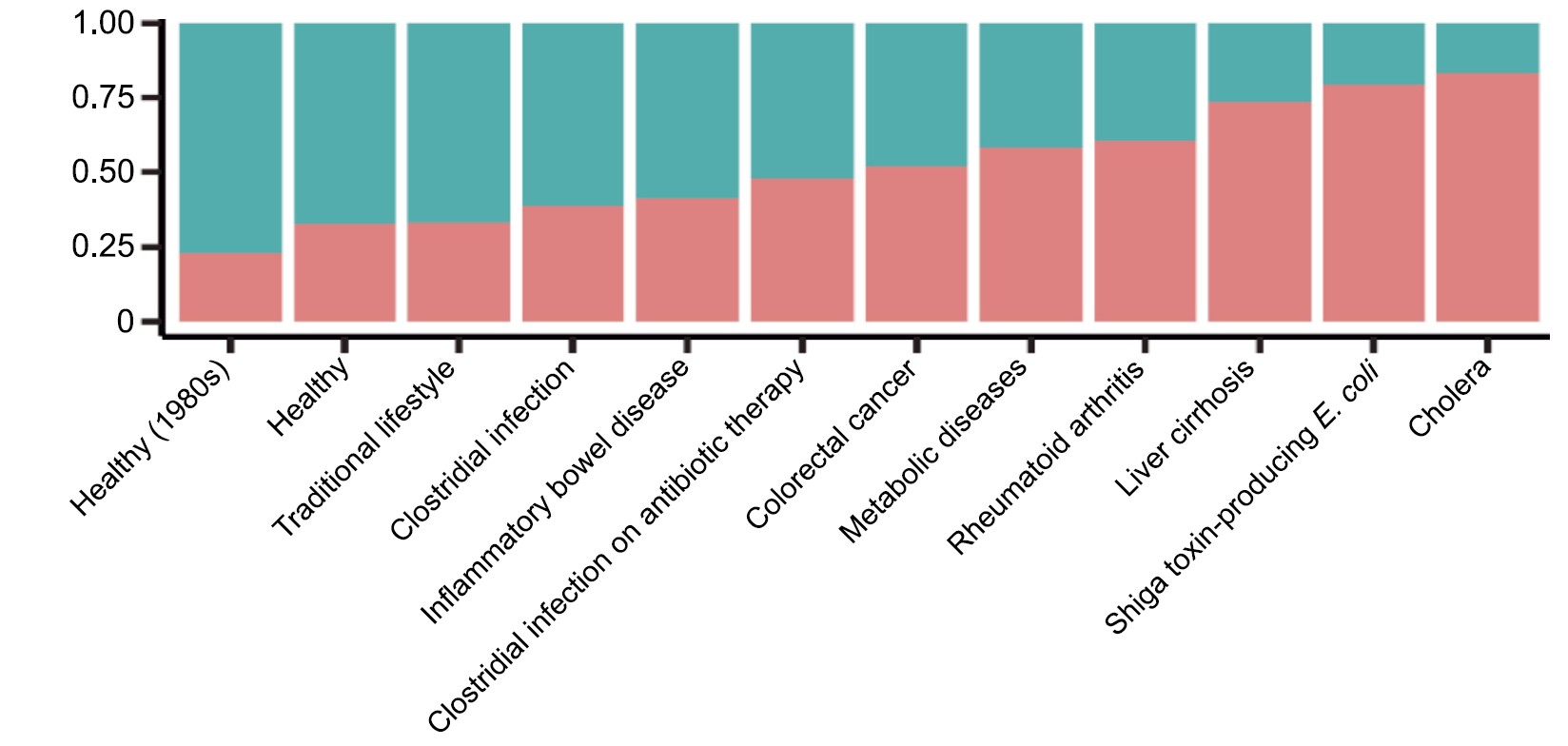 When analyzing the frequencies of occurrence of resistotypes and the representation of AMR genes in them, it was found that the resistotype with a lower frequency of occurrence in the population is more than 10 times enriched with resistance genes to fluoroquinolones, fosfomycins, aminoglycosides and peptide antibiotics, as well as genes determining MDR, compared to the other resistotype, which is found in a larger number of samples. The first, rarer resistotype was designated by the abbreviation FAMP, based on the first letters of the names of the antibiotic groups whose resistance genes are characteristic of this resistotype (Fluoroquinolones, Fosfomycins, Aminoglycosides, Multi-drug resistance, Peptide antibiotics). The other resistotype was labeled as background. Importantly, no association with enterotypes was found for the identified resistotypes, but associations with specific bacterial taxa were established. Thus, the species associated with the FAMP resistotype were predominantly from the Proteobacteria phylum, in particular, from the Enterobacteriaceae family. At the same time, the frequency of FAMP resistotype occurrence was correlated with patient groups by health status: in healthy patients, the proportion of FAMP samples was minimal, while FAMP resistotype was most frequently found in groups of patients with intestinal infections such as cholera (83.3%) and Shiga toxin-producing Escherichia coli (79.4%) (Fig. 3).