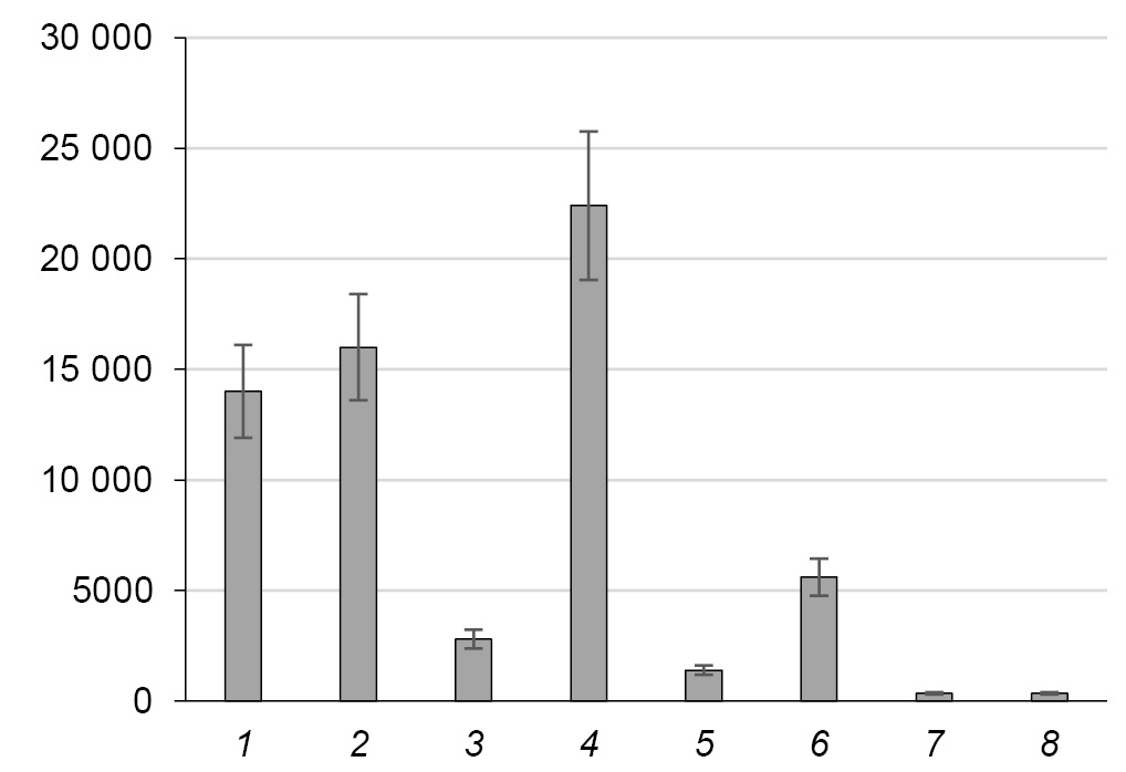 The level of IgG antibodies in the sera of immunized mice was detected by enzyme-linked immunosorbent assay. Sera of intact mice (n = 5) were used as a negative control. The concentration of antigens for adsorption on the plates was: PT — 2 μg/mL; FHA — 2 μg/mL; PRN — 2 μg/mL; LPS — 2.5 μg/mL. Peroxidase antispecies conjugate to mouse IgG (Invitrogen) and tetramethylbenzidine as substrate mixture were used in the experiments. The reaction results were counted using a Multiskan vertical scanning spectrophotometer (Thermo Scientific) at a wavelength of 450 nm. The values inverse to their maximum dilutions, at which the optical density (OD) values were 2 or more times higher than the OD values in the negative control wells, were taken as the serum titer.