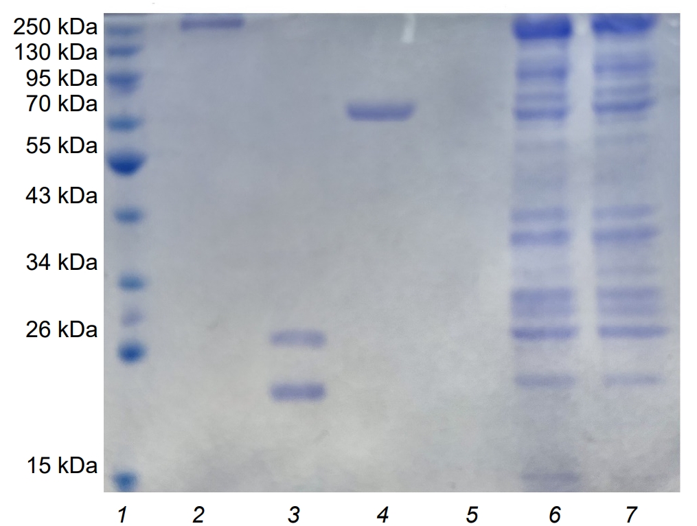 The tracks on the electrophoregram are: 1 — molecular weight markers; 2 — FHA; 3 — PT; 4 — PRN; 5 — LPS; 6 — AC strain No. 317 (biofilm culture); 7 — AC strain No. 317 (planktonic culture).