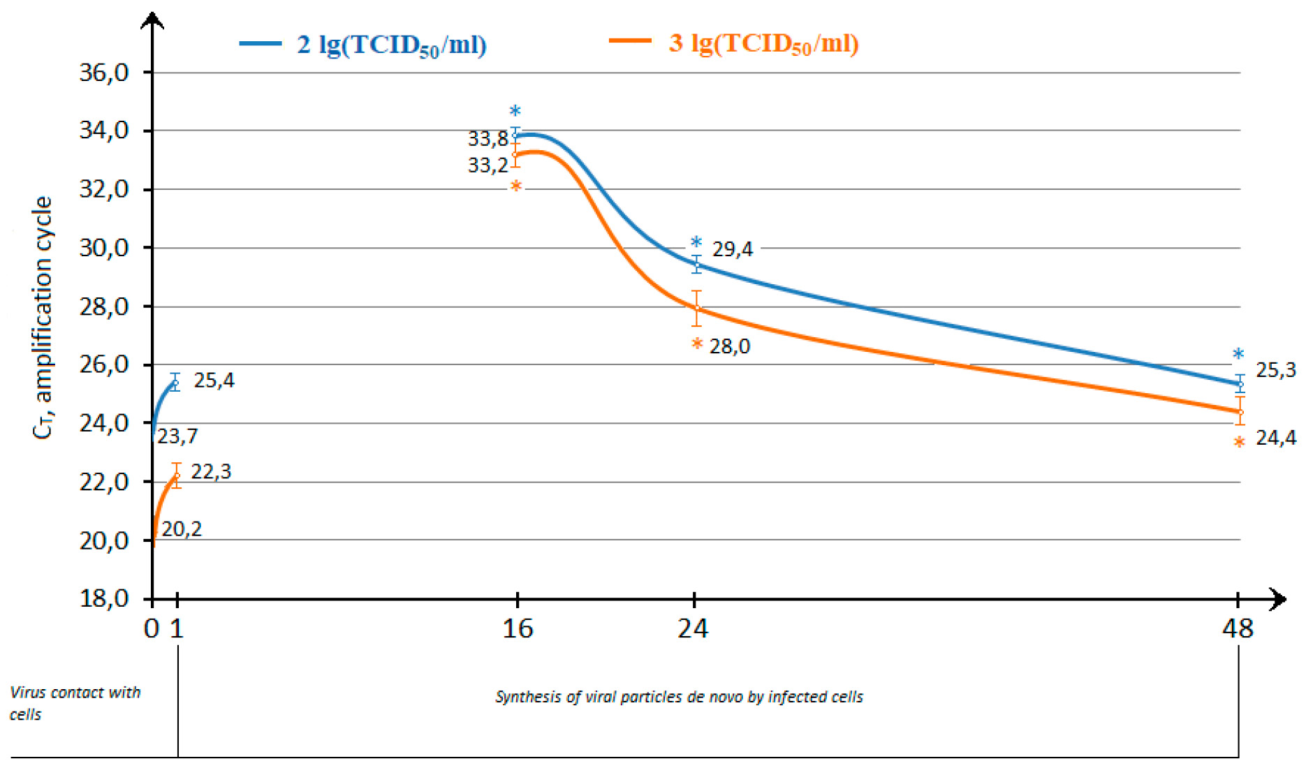 Fig. 1. Dynamics of viral load: lower CT values correspond to higher virion concentration values, and vice versa. During the 1st hour after virus inoculation, the concentration of virions decreases due to their penetration into target cells. After that, the medium changes and de novo accumulation of progeny virions produced by infected cells begins (*p ≤ 0.05 when compared to the CT value at the previous time point).