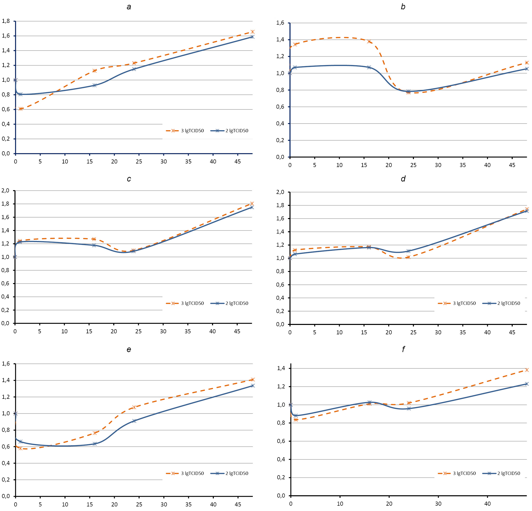 CHO activity initially decreased in a dose-dependent manner (Fig. 2, e) but then returned to the level of the uninfected control as early as 16 h after virus inoculation (γ(16) ≈ γ(24) ≈ 1.0), and then it increased to γ(48) ≈ 1.2 for dose 2 lg(TCID50) and to γ(48) ≈ 1.4 for dose 3 lg(TCID50).